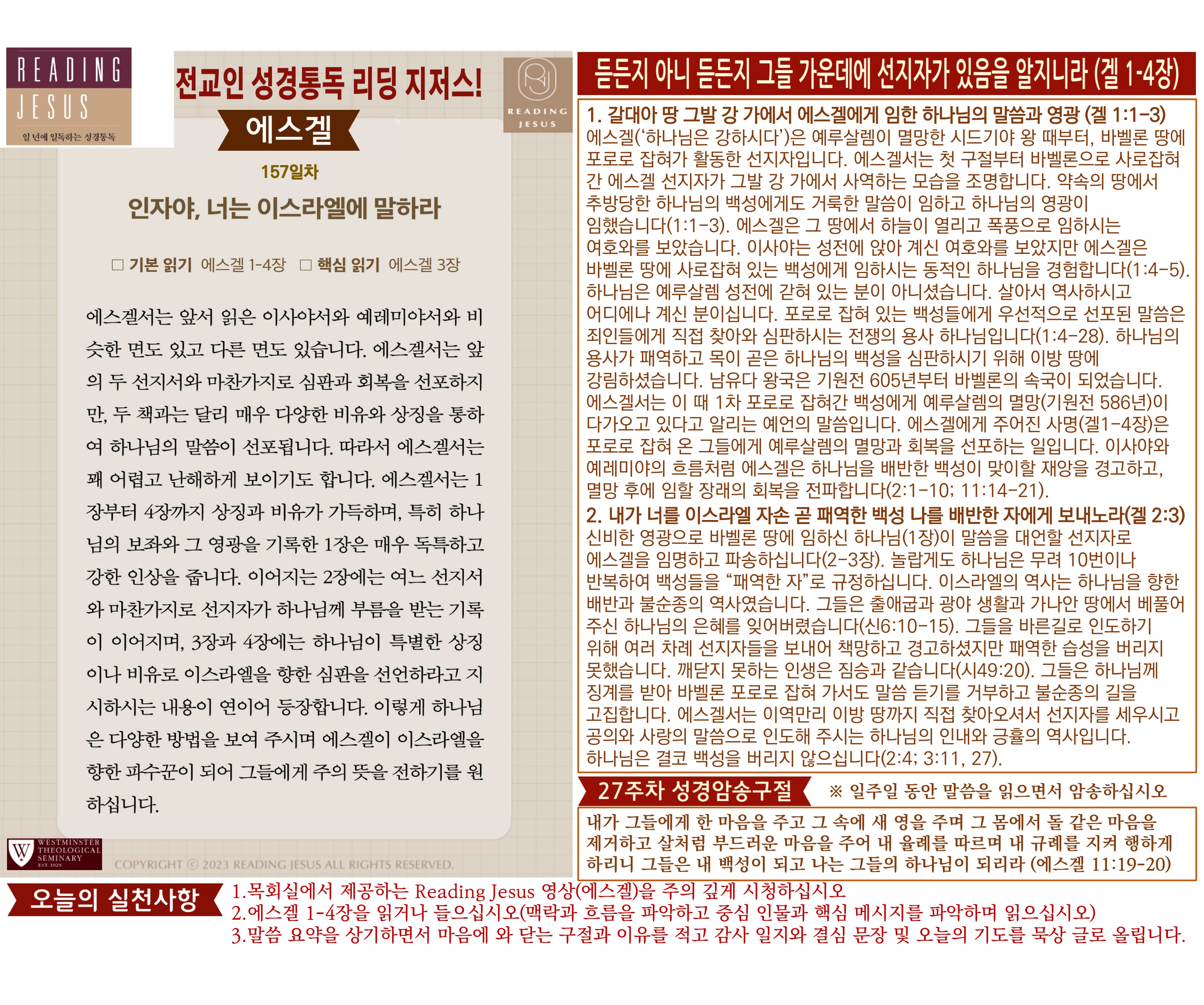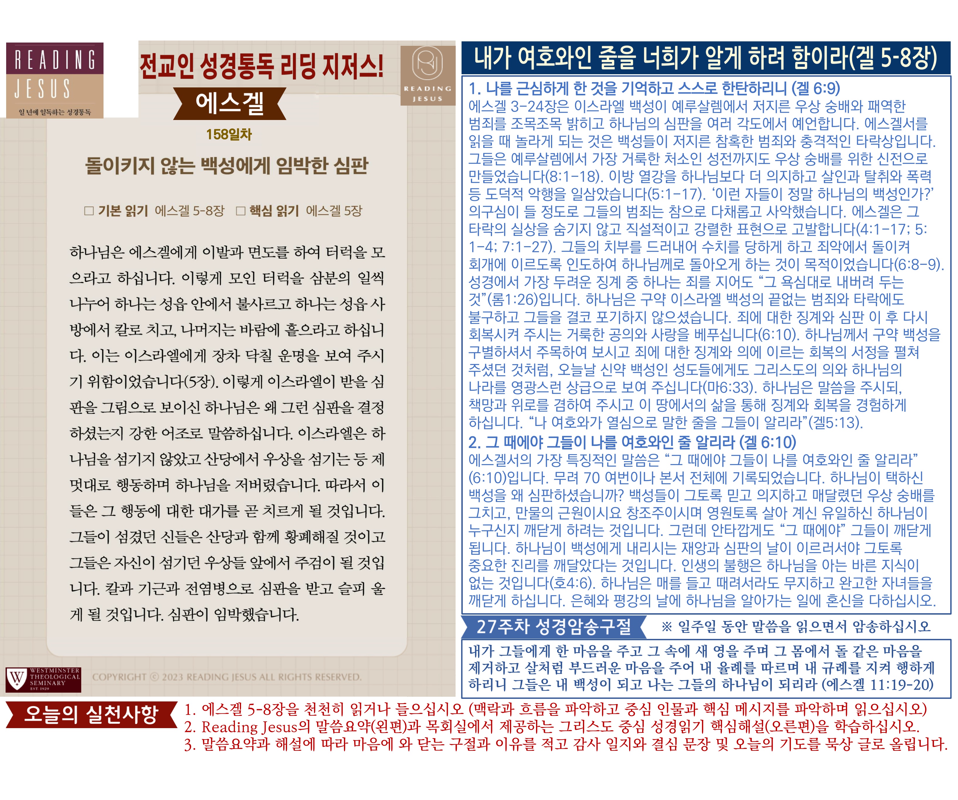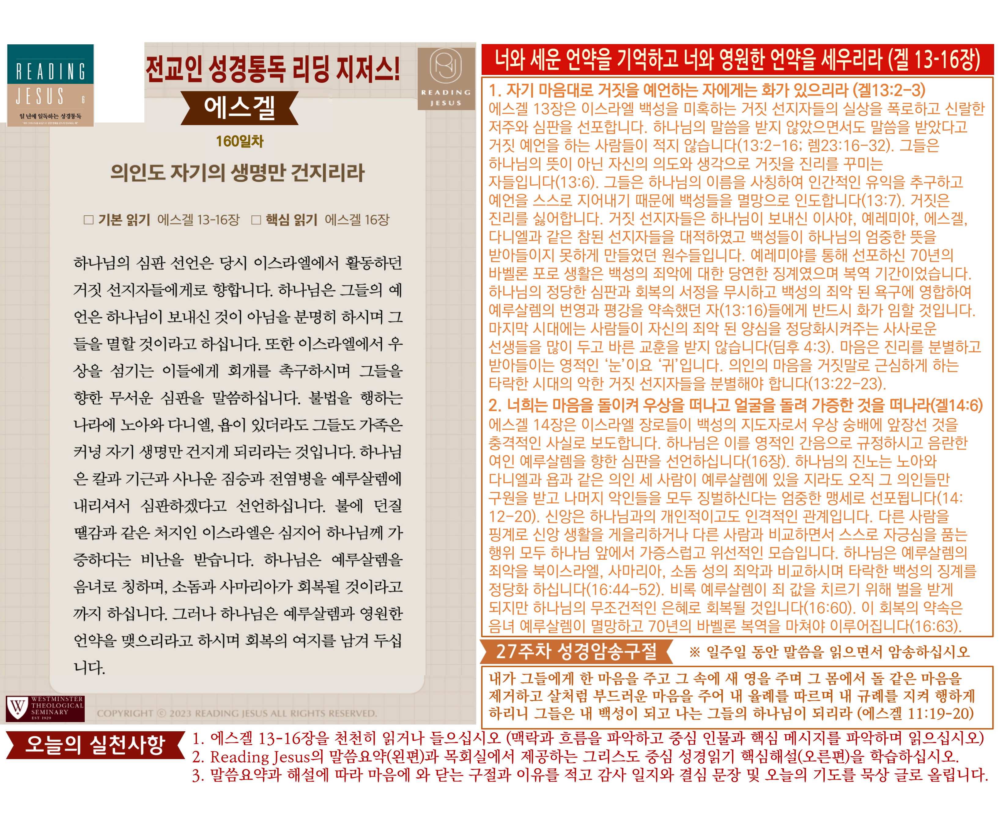 그리스도 중심 성경읽기, 리딩지저스 말씀 요약 | 27주차 : 에스겔 1 관리자 교재와 해설 0 2 3시간전 Author 1 1 Lv.77 관리자 최고관리자 369,130 (94.5%) 너희 안에 이 마음을 품으라 곧 그리스도 예수의 마음이니(빌립보서 2:5) Let this mind be in you, which was also in Christ Jesus(Philippians 2:5)