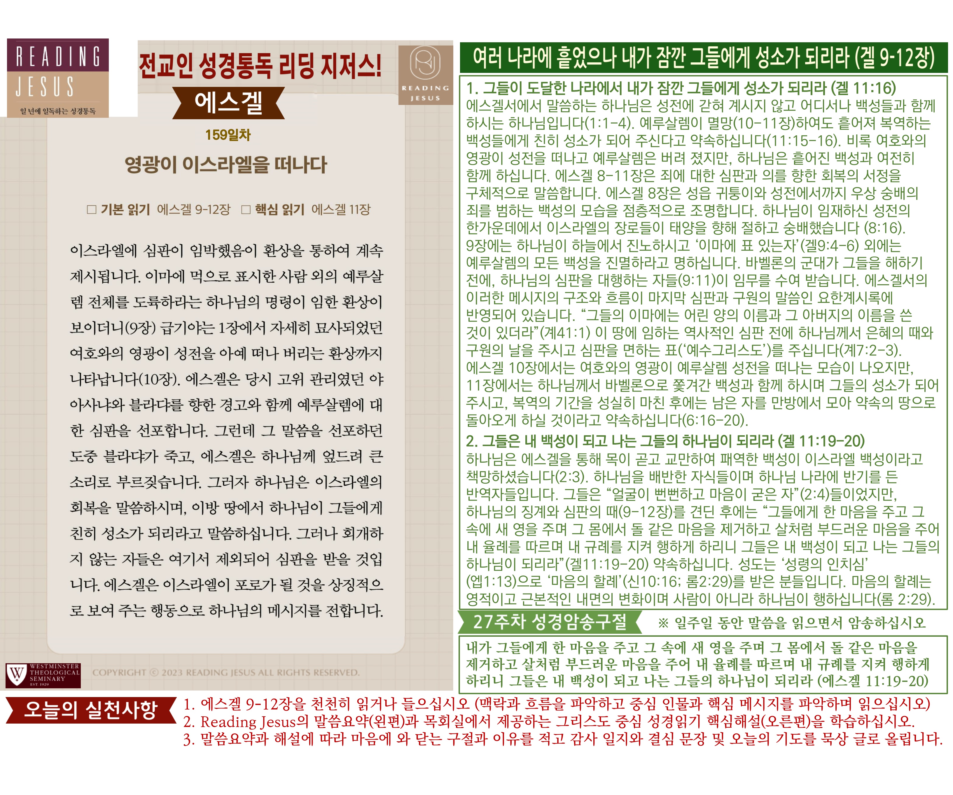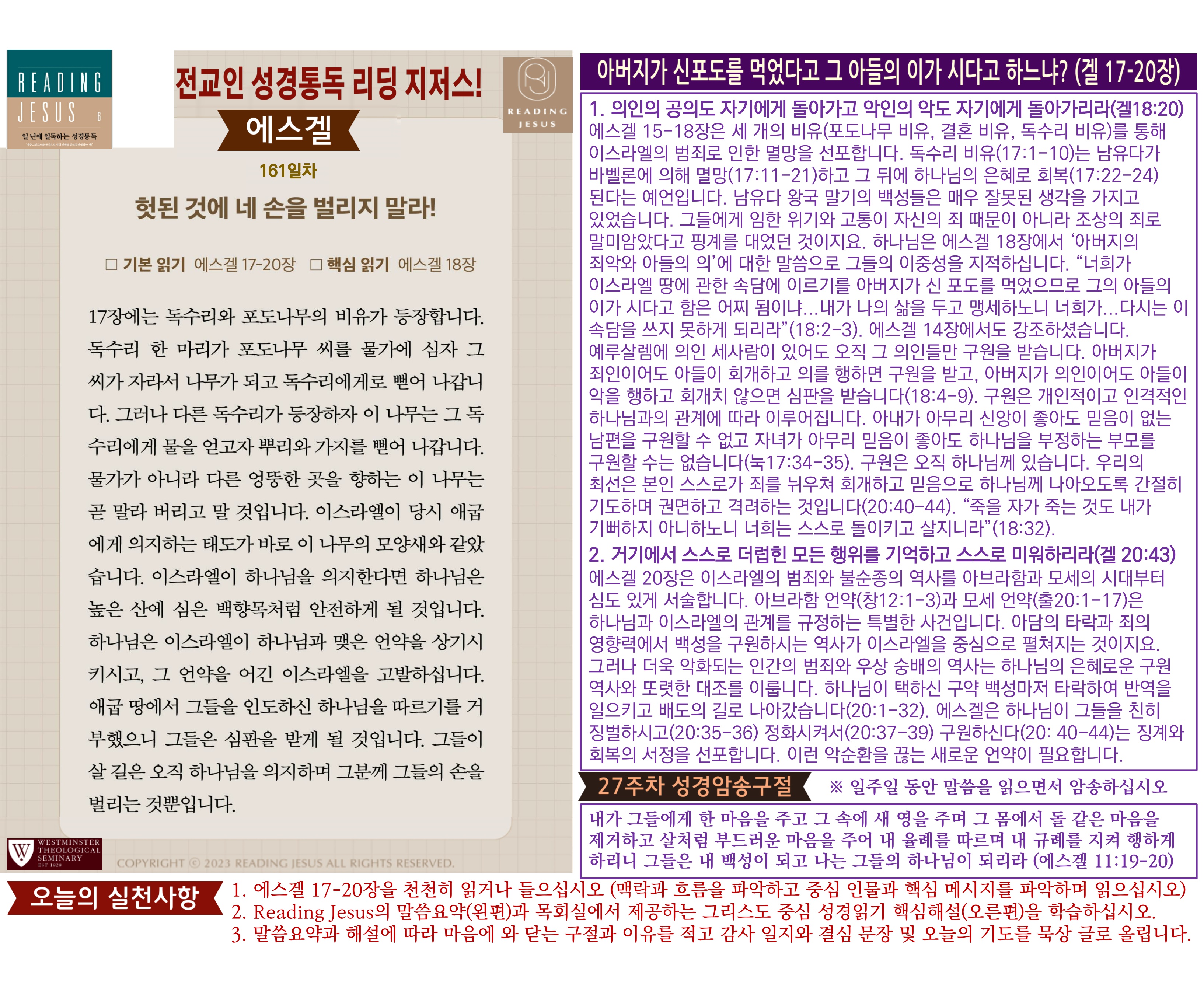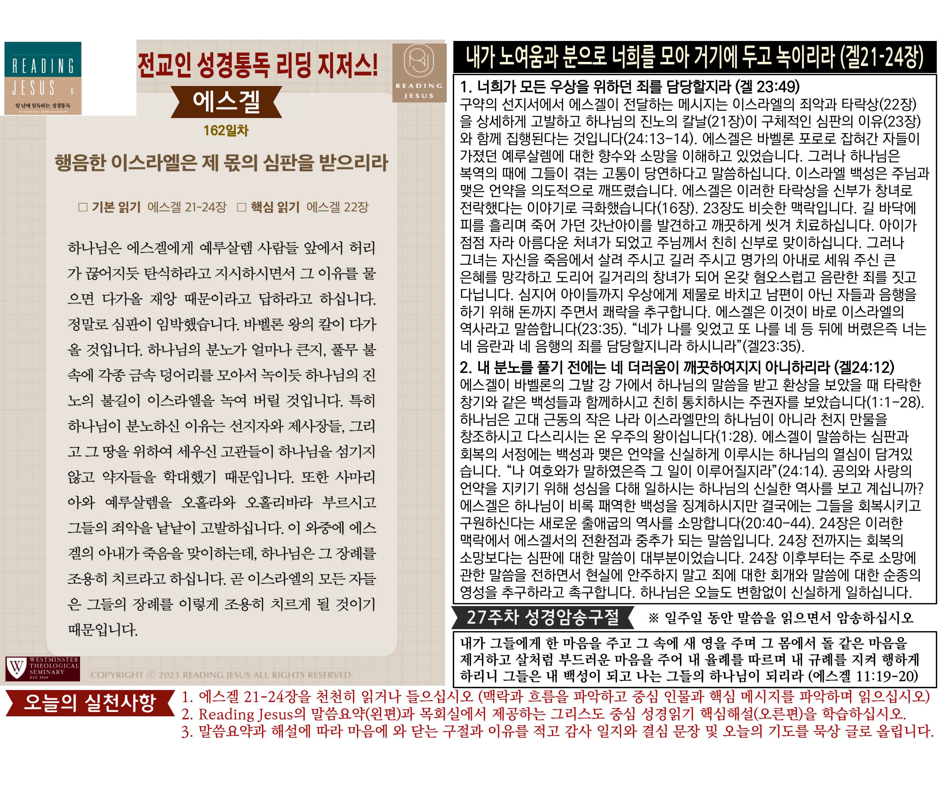 그리스도 중심 성경읽기, 리딩지저스 말씀 요약 | 27주차 : 에스겔 1 관리자 교재와 해설 0 2 3시간전 Author 1 1 Lv.77 관리자 최고관리자 369,130 (94.5%) 너희 안에 이 마음을 품으라 곧 그리스도 예수의 마음이니(빌립보서 2:5) Let this mind be in you, which was also in Christ Jesus(Philippians 2:5)