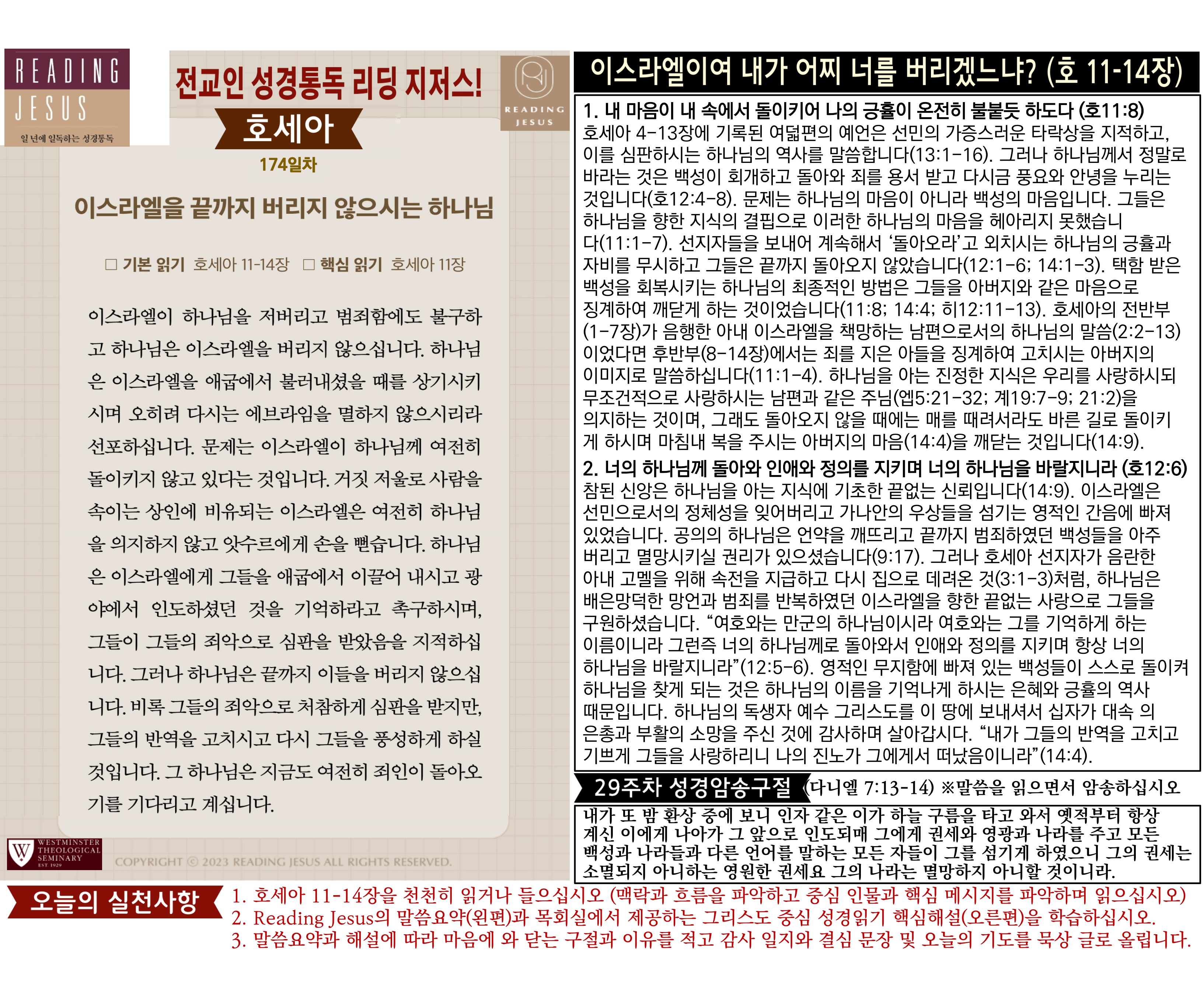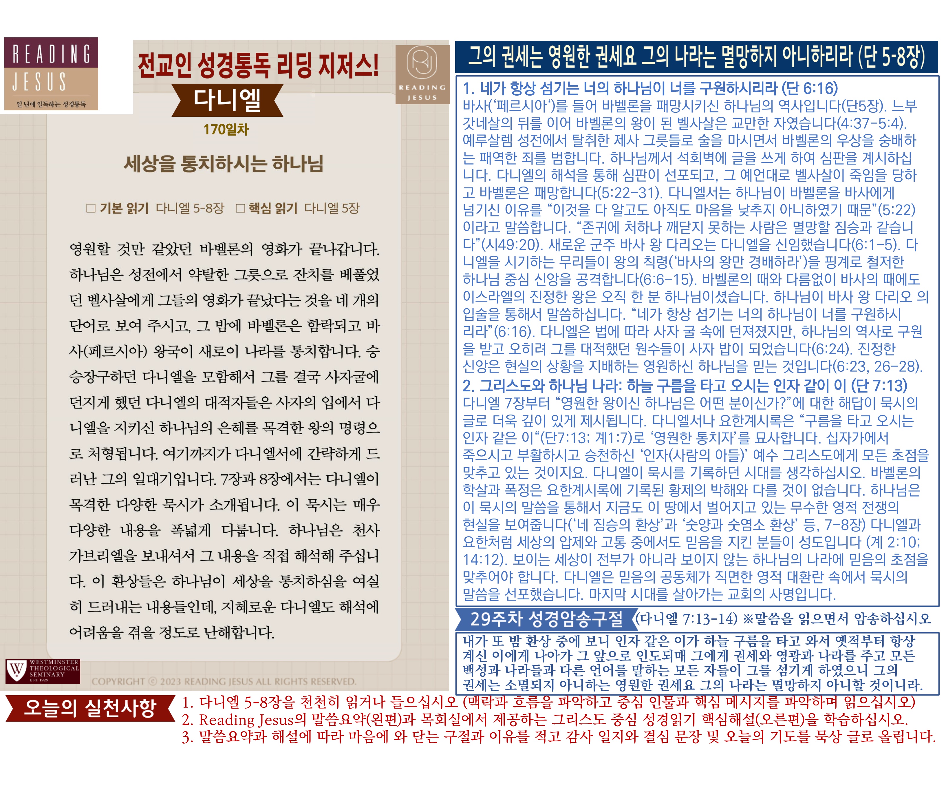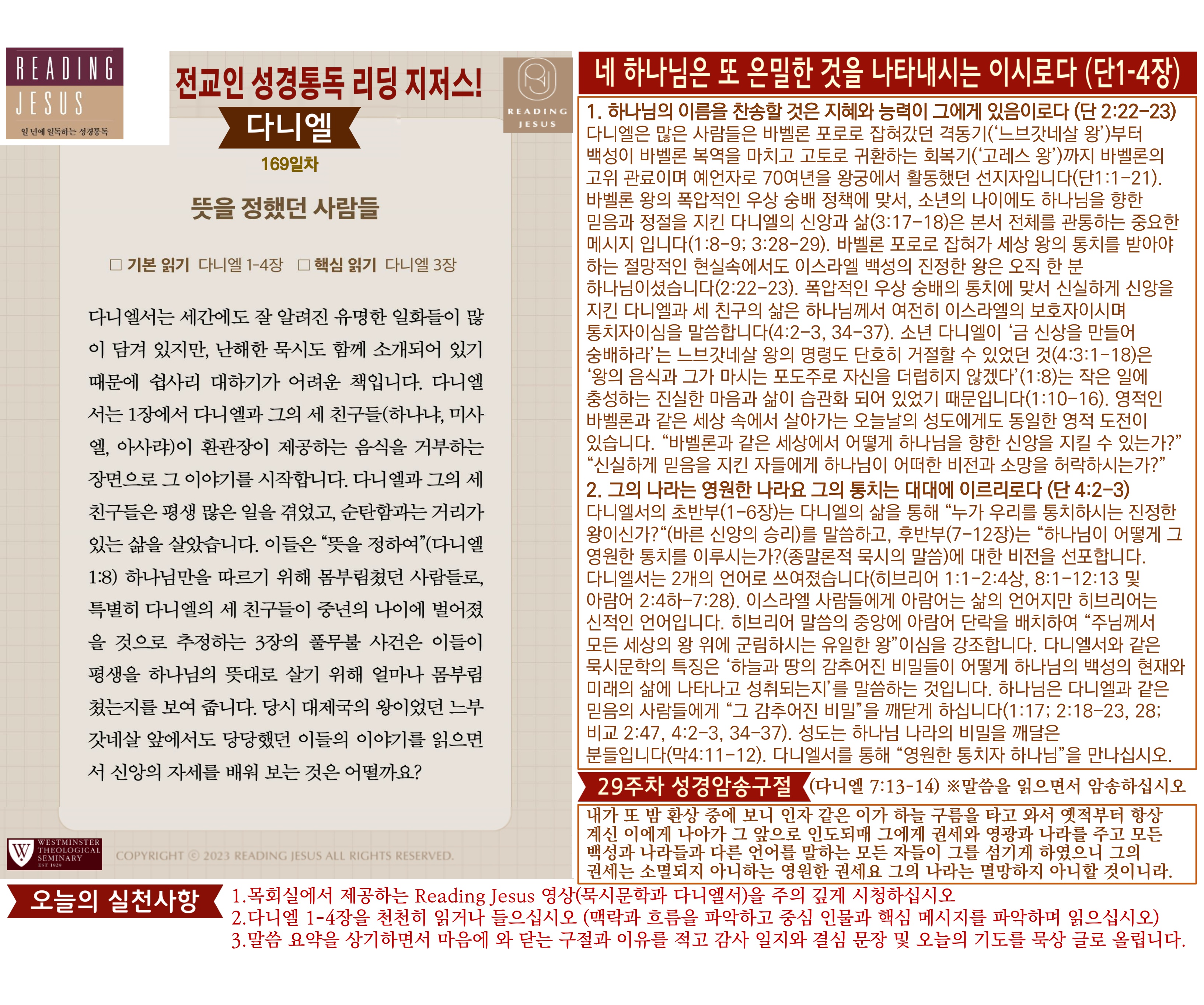 그리스도 중심 성경읽기, 리딩지저스 말씀 요약 | 29주차 : 다니엘, 호세아 관리자 교재와 해설 0 54 04.06 16:02 Author 1 1 Lv.78 관리자 최고관리자 370,180 (6.6%) 너희 안에 이 마음을 품으라 곧 그리스도 예수의 마음이니(빌립보서 2:5) Let this mind be in you, which was also in Christ Jesus(Philippians 2:5)