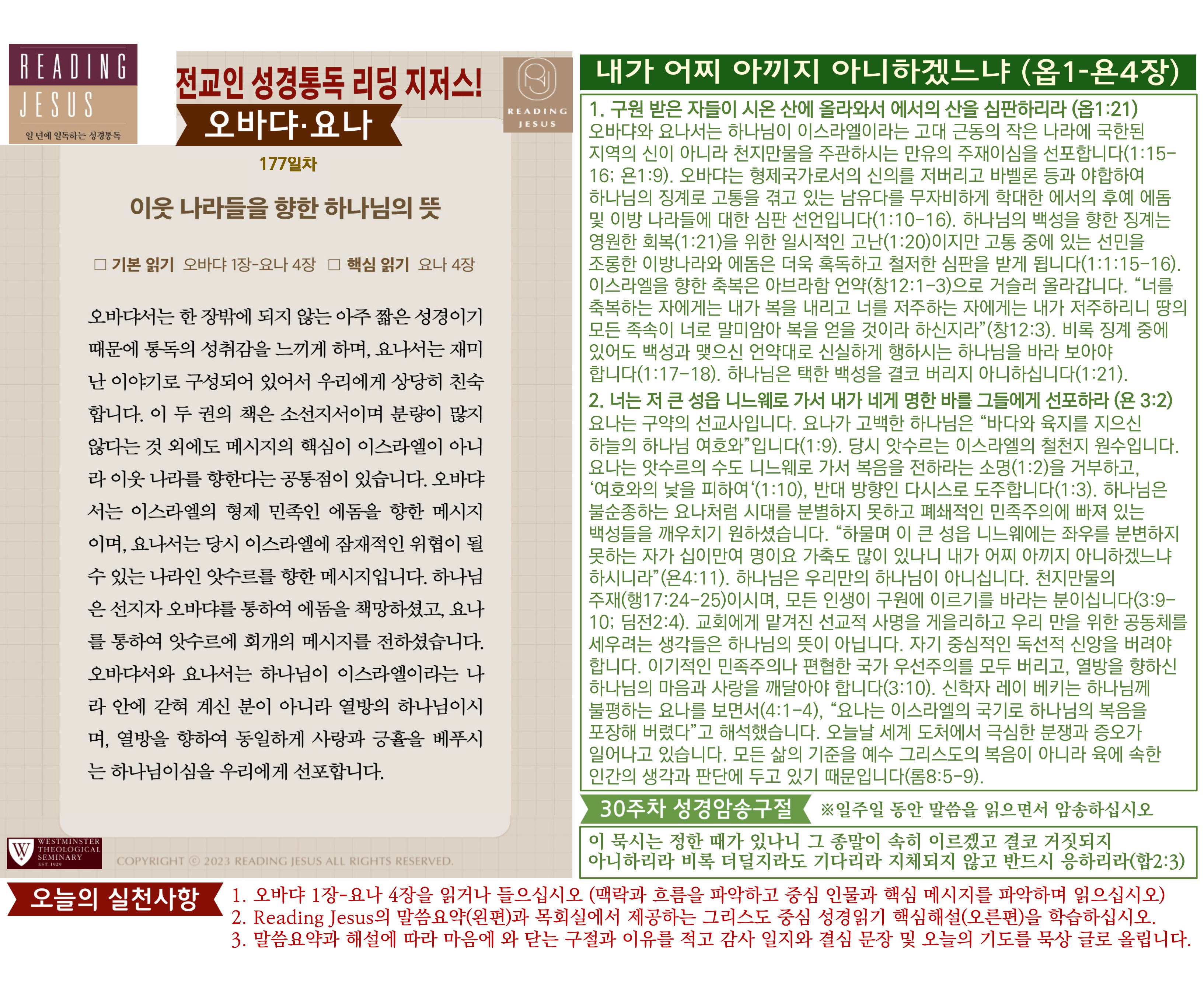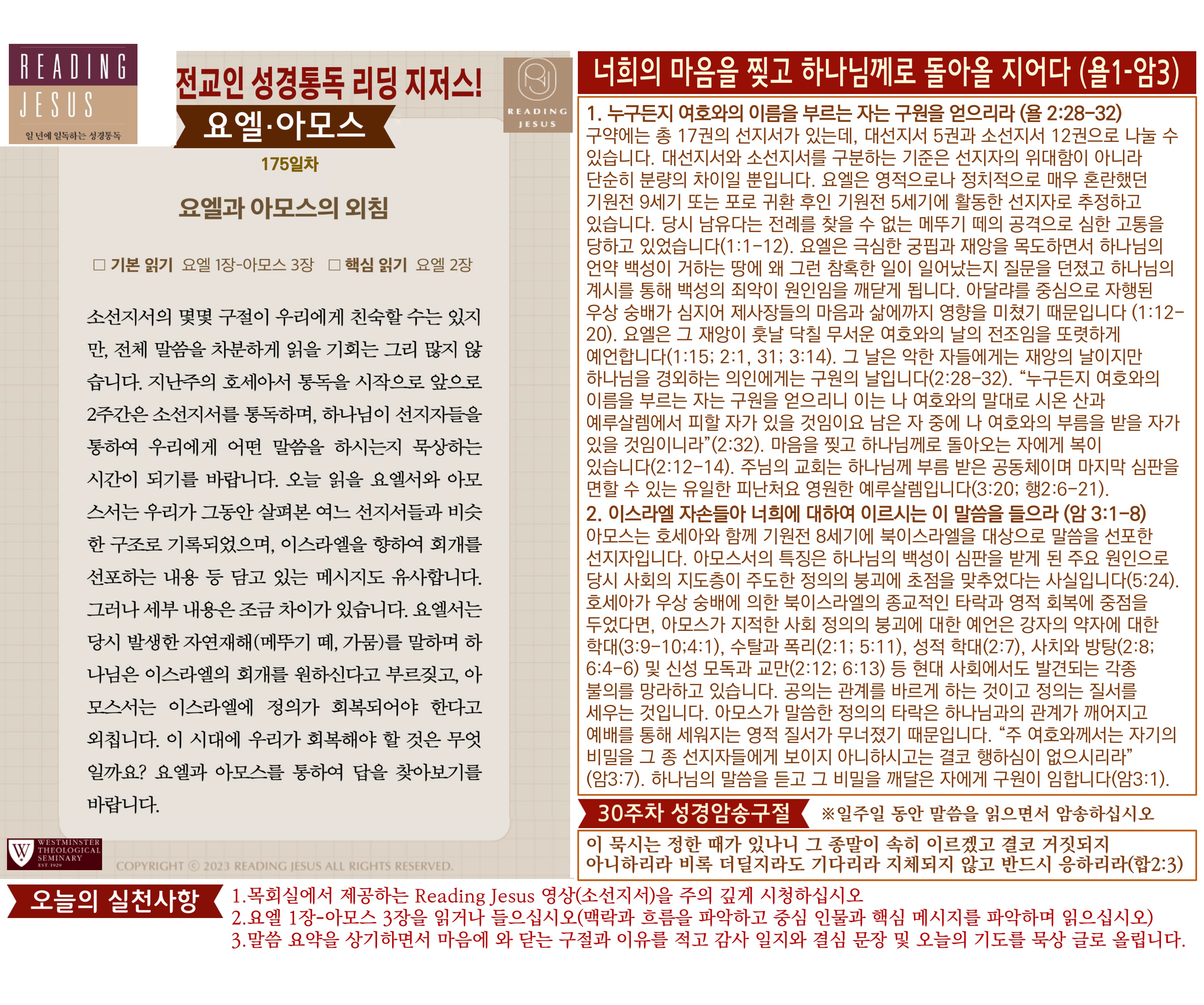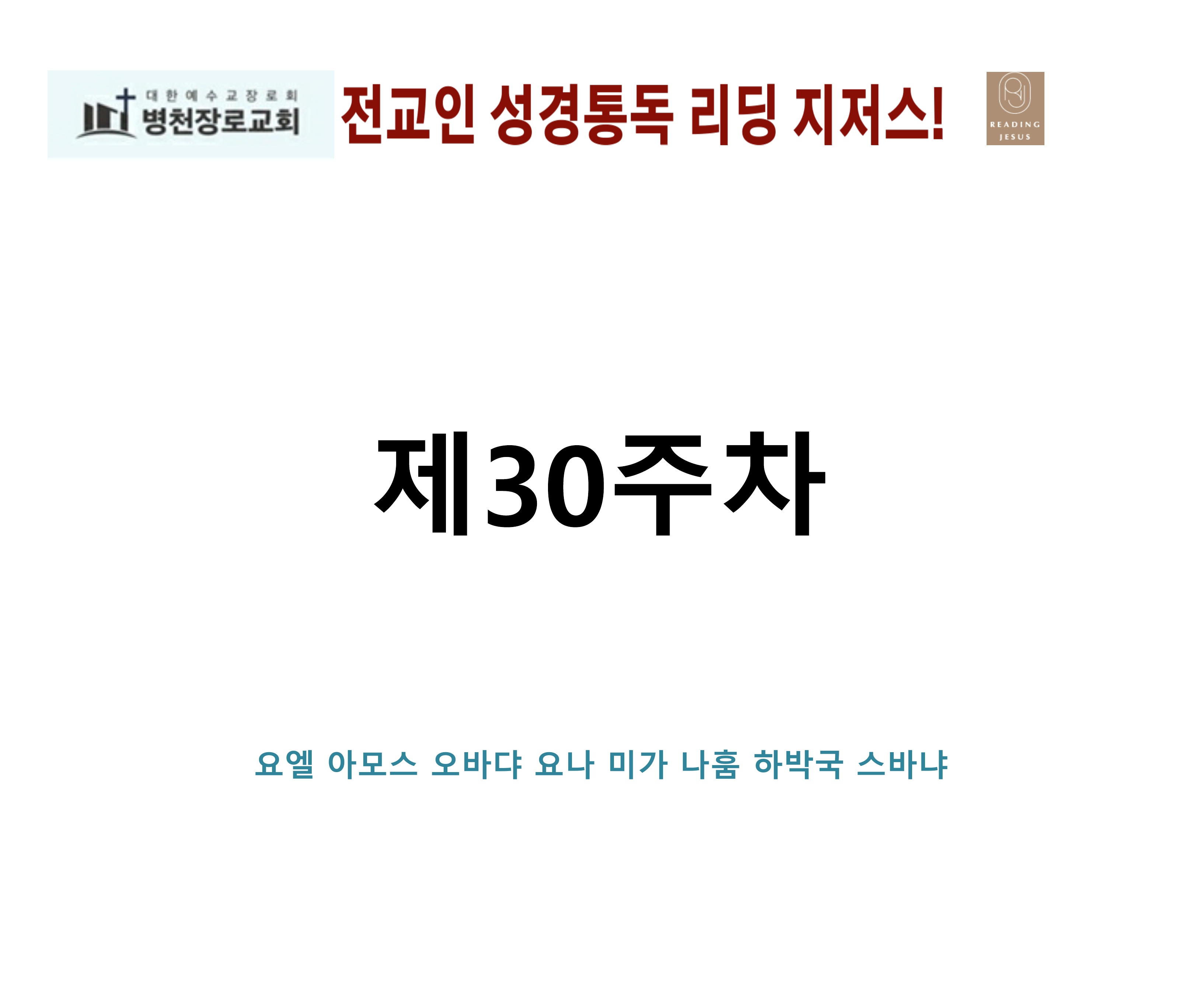 그리스도 중심 성경읽기, 리딩지저스 말씀 요약 | 30주차 : 요엘 아모스 오바댜 요나 미가 나훔 하박국 스바냐 관리자 교재와 해설 0 11 04.06 16:05 그리스도 중심 성경읽기, 리딩지저스 말씀 요약 | 30주차 : 요엘 아모스 오바댜 요나 미가 나훔 하박국 스바냐 Author 1 1 Lv.78 관리자 최고관리자 369,780 (2%) 너희 안에 이 마음을 품으라 곧 그리스도 예수의 마음이니(빌립보서 2:5) Let this mind be in you, which was also in Christ Jesus(Philippians 2:5)