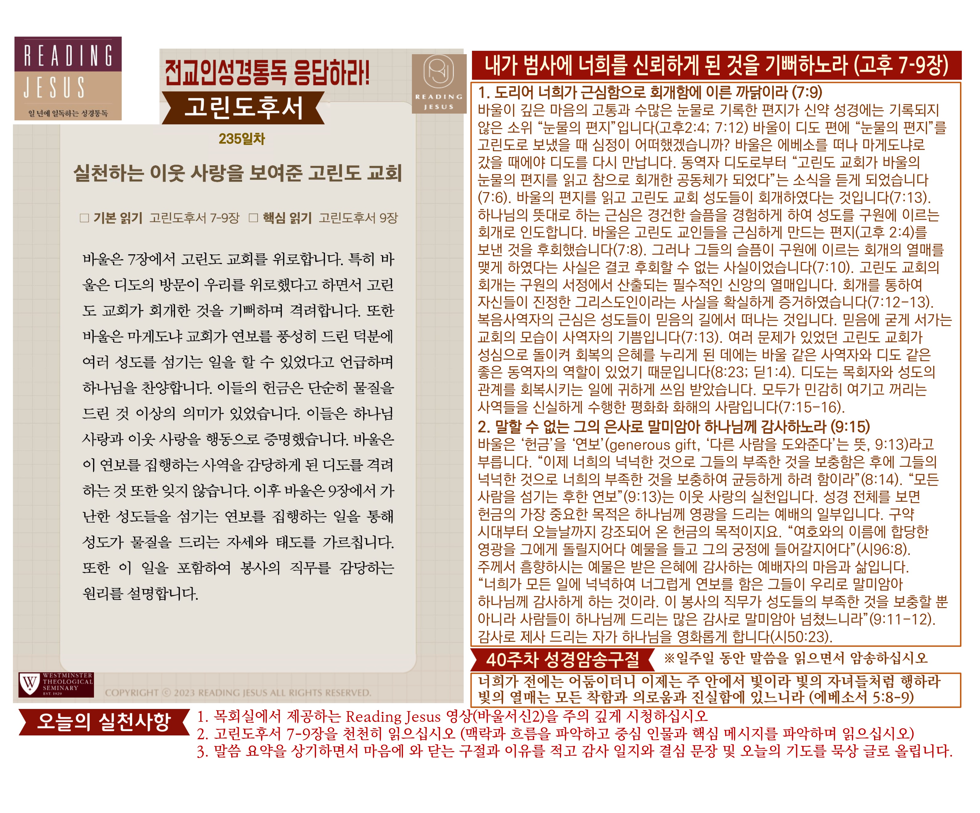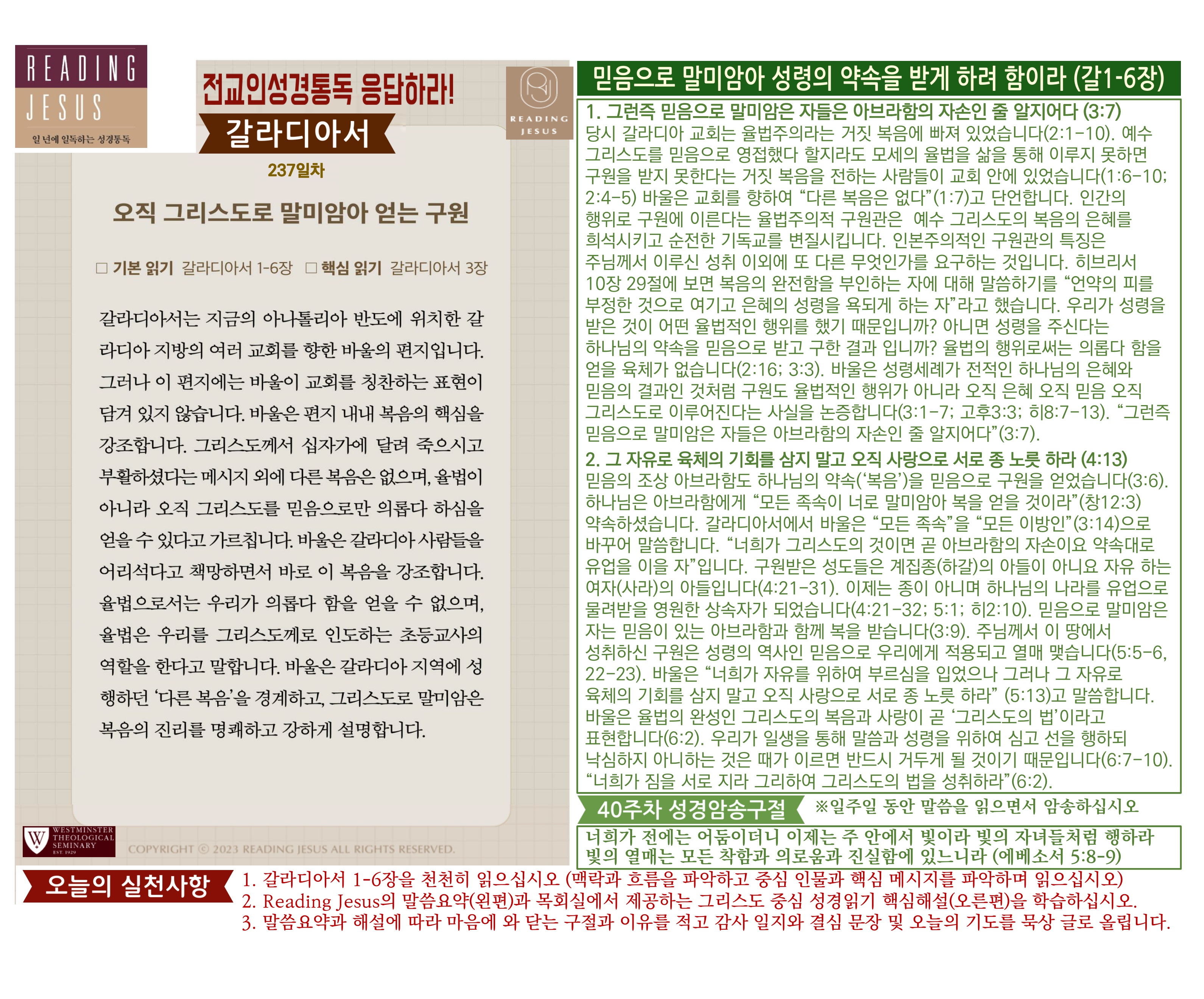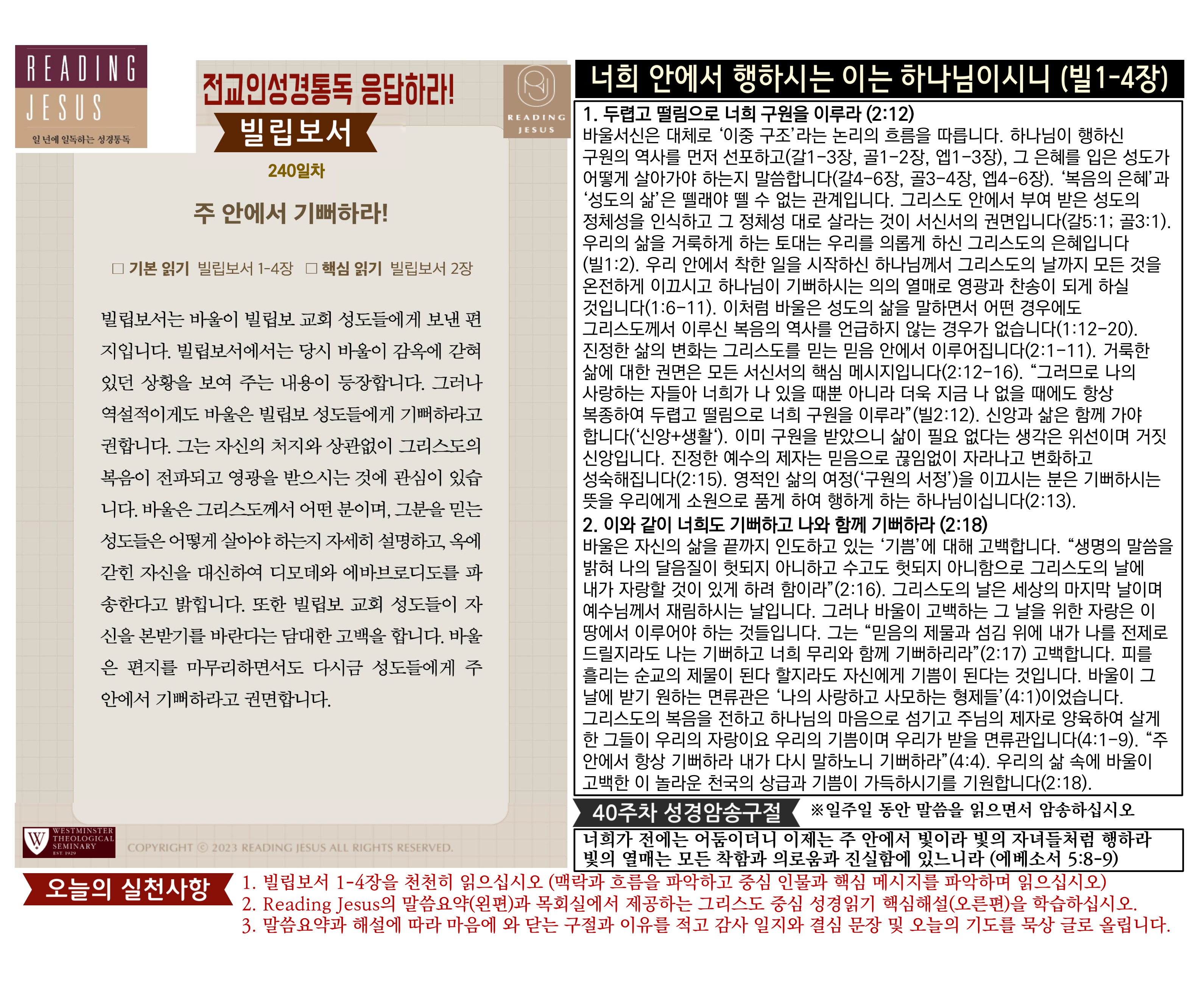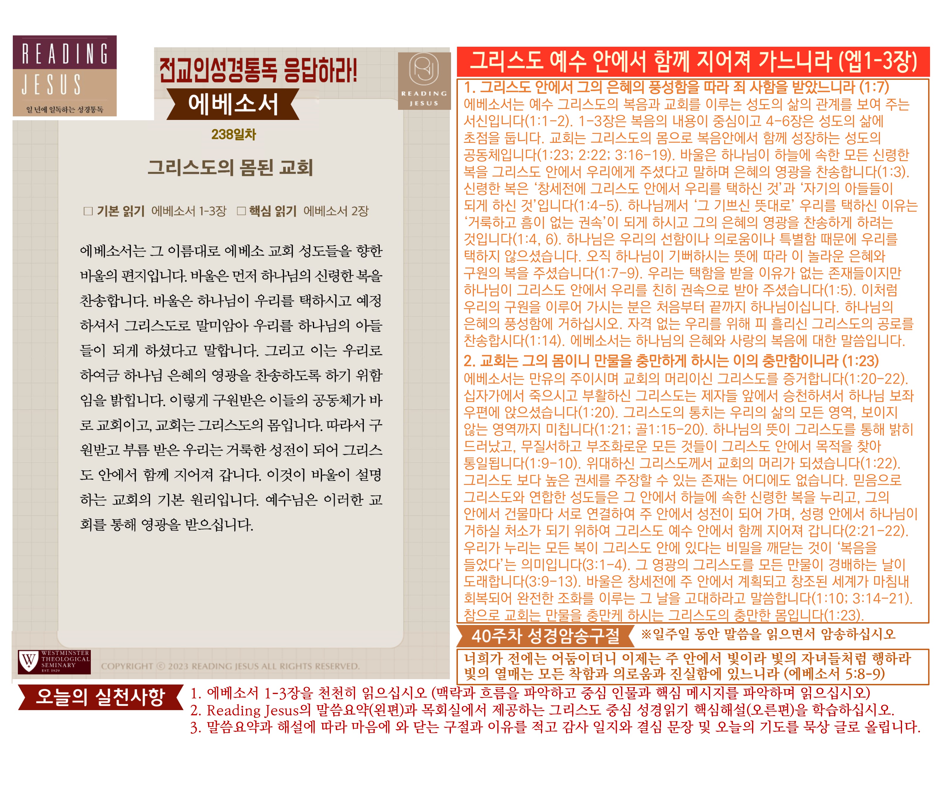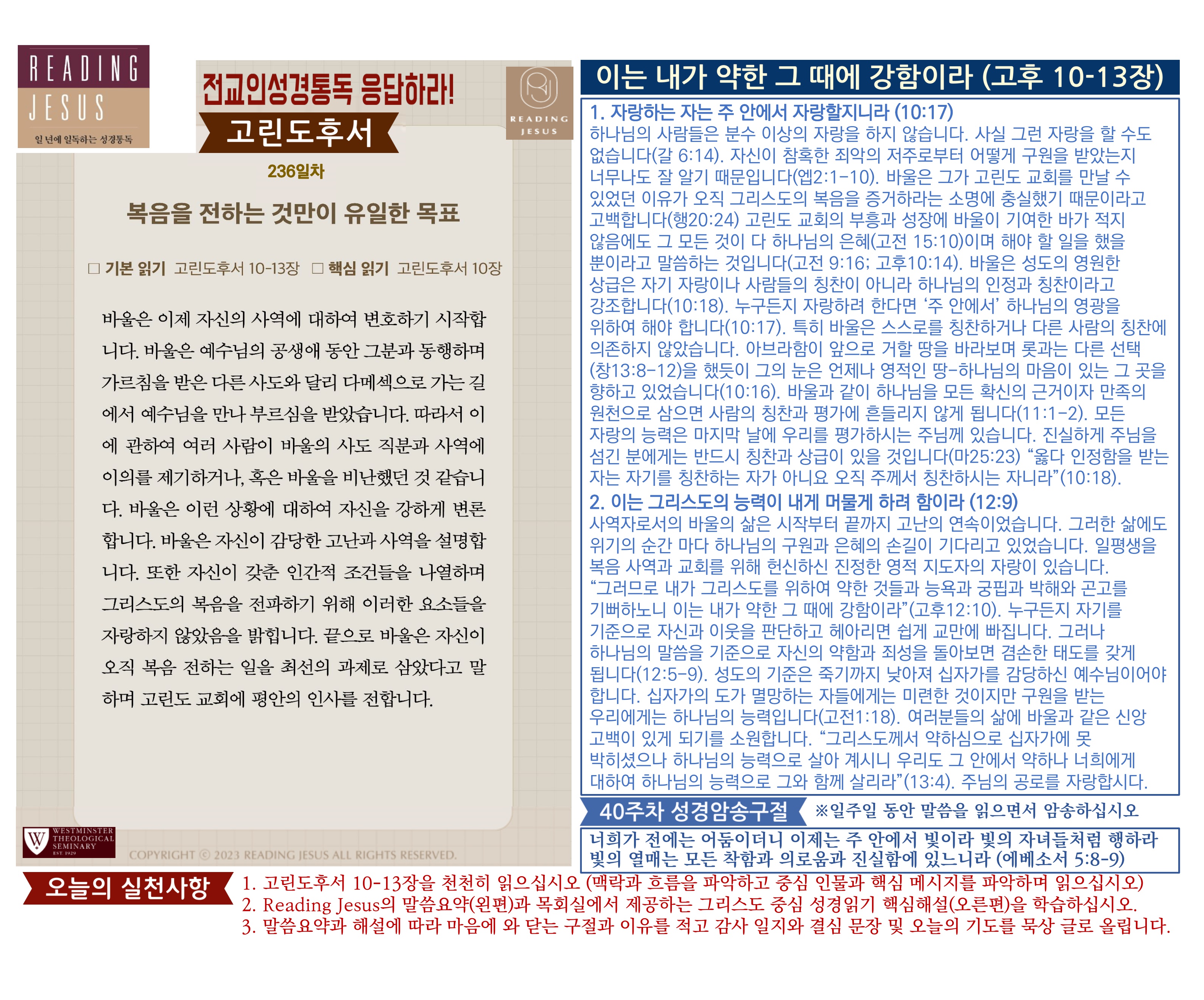그리스도 중심 성경읽기, 리딩지저스 말씀 요약 | 40주차 : 고린도후서 갈라디아서 에베소서 빌립보서 관리자 교재와 해설 0 1 3시간전 그리스도 중심 성경읽기, 리딩지저스 말씀 요약 | 40주차 : 고린도후서 갈라디아서 에베소서 빌립보서 Author 1 1 Lv.78 관리자 최고관리자 370,580 (11.2%) 너희 안에 이 마음을 품으라 곧 그리스도 예수의 마음이니(빌립보서 2:5) Let this mind be in you, which was also in Christ Jesus(Philippians 2:5)