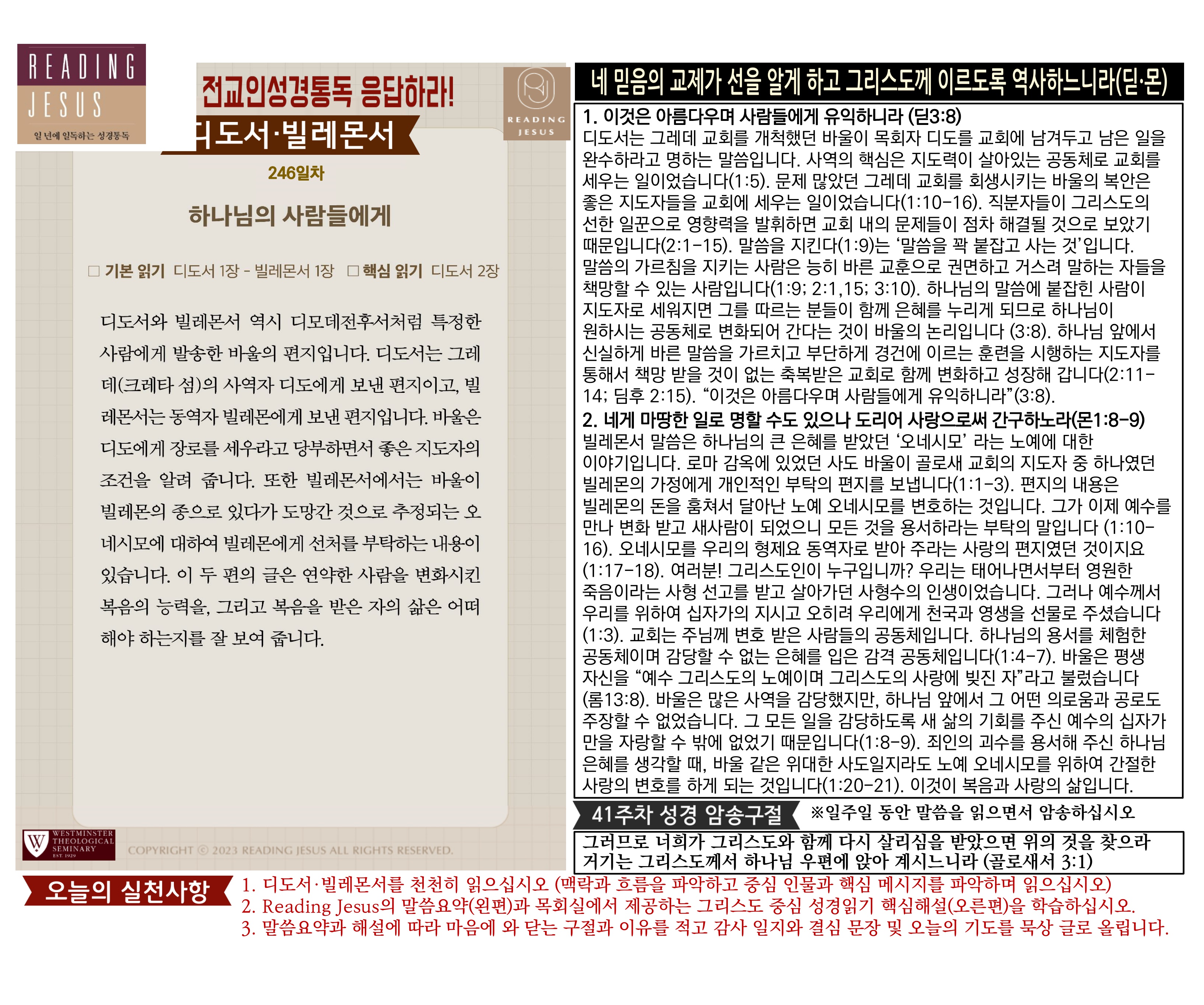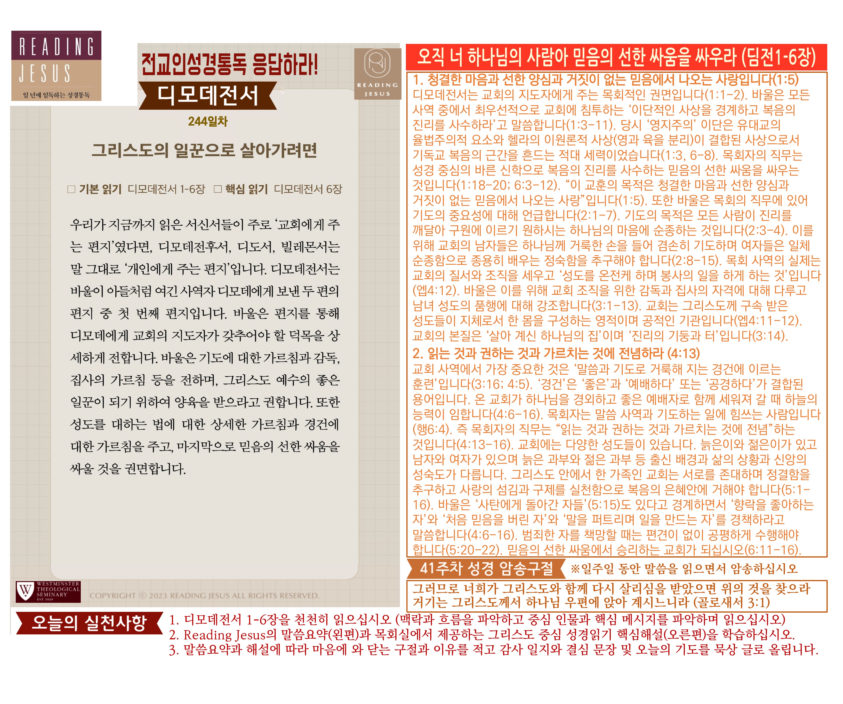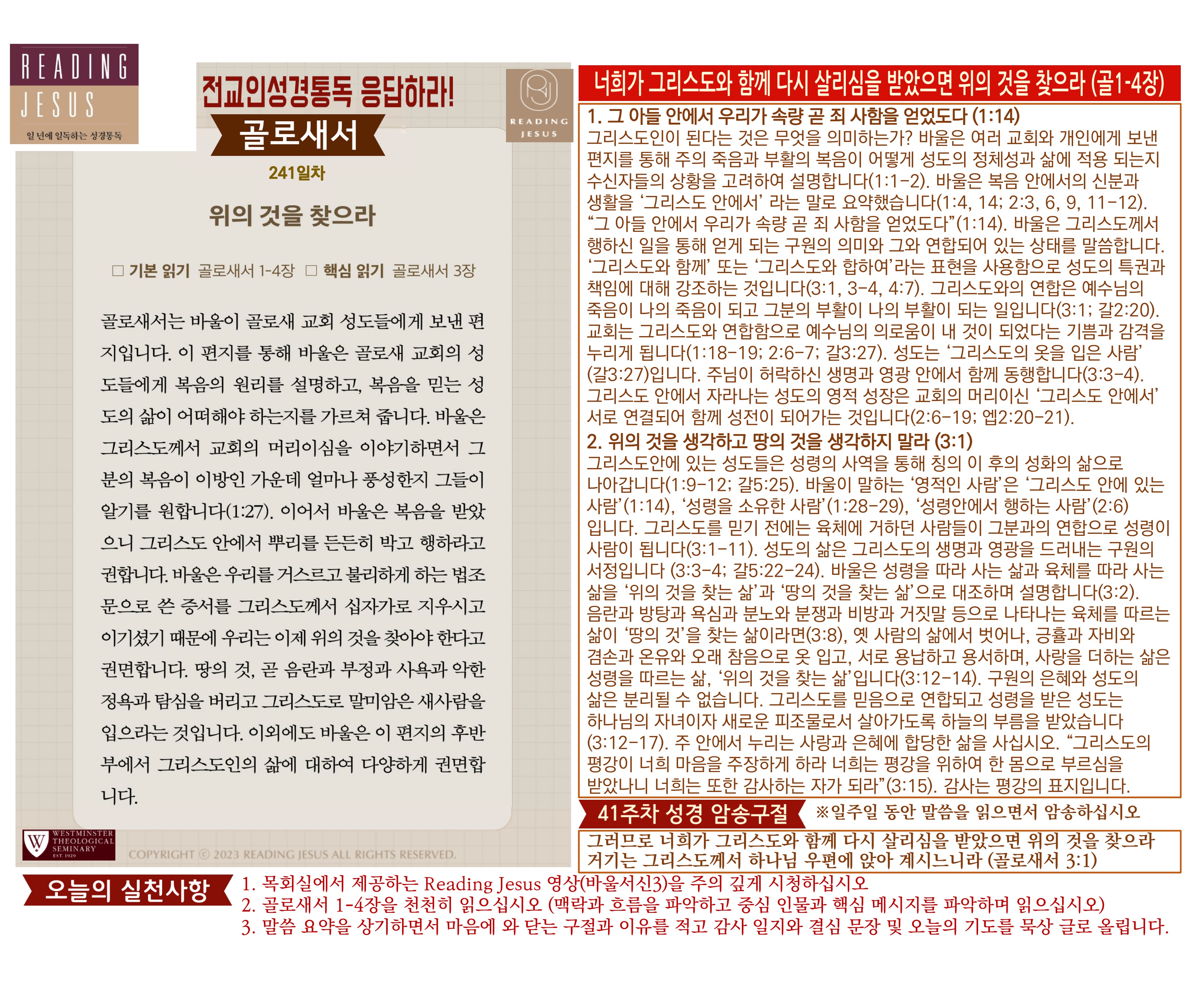 그리스도 중심 성경읽기, 리딩지저스 말씀 요약 | 41주차 : 골로새서 데살로니가전서 후서 디모데 전서 후서 디도서 빌레몬서 관리자 교재와 해설 0 1 3시간전 그리스도 중심 성경읽기, 리딩지저스 말씀 요약 | 41주차 : 골로새서 데살로니가전서 후서 디모데 전서 후서 디도서 빌레몬서 Author 1 1 Lv.78 관리자 최고관리자 370,580 (11.2%) 너희 안에 이 마음을 품으라 곧 그리스도 예수의 마음이니(빌립보서 2:5) Let this mind be in you, which was also in Christ Jesus(Philippians 2:5)