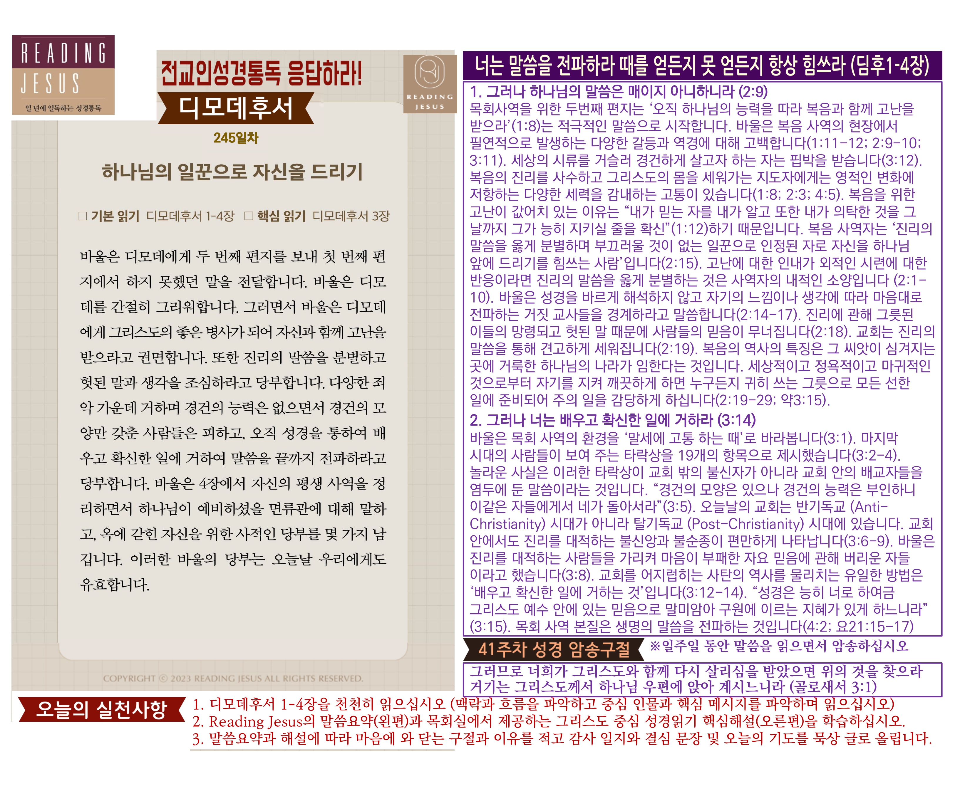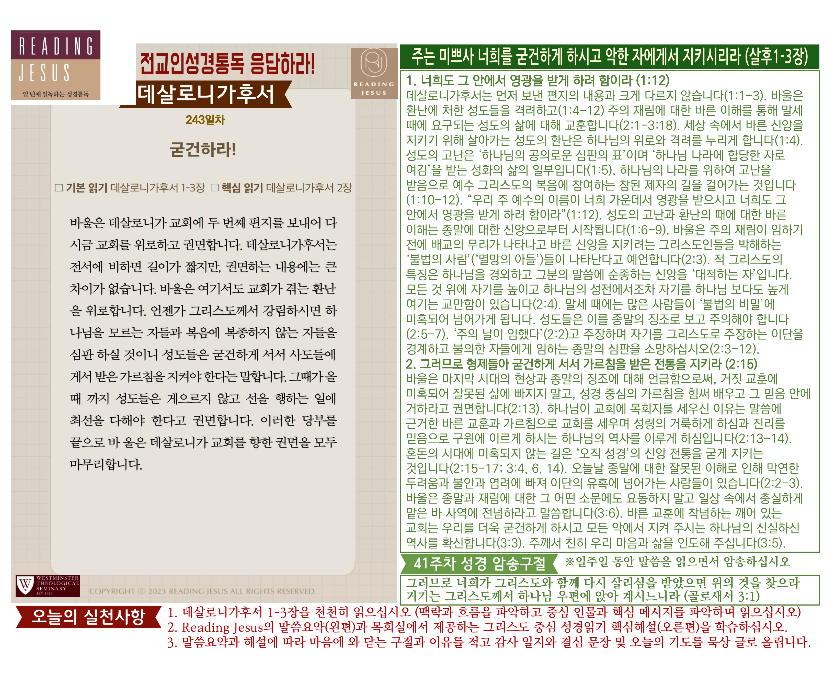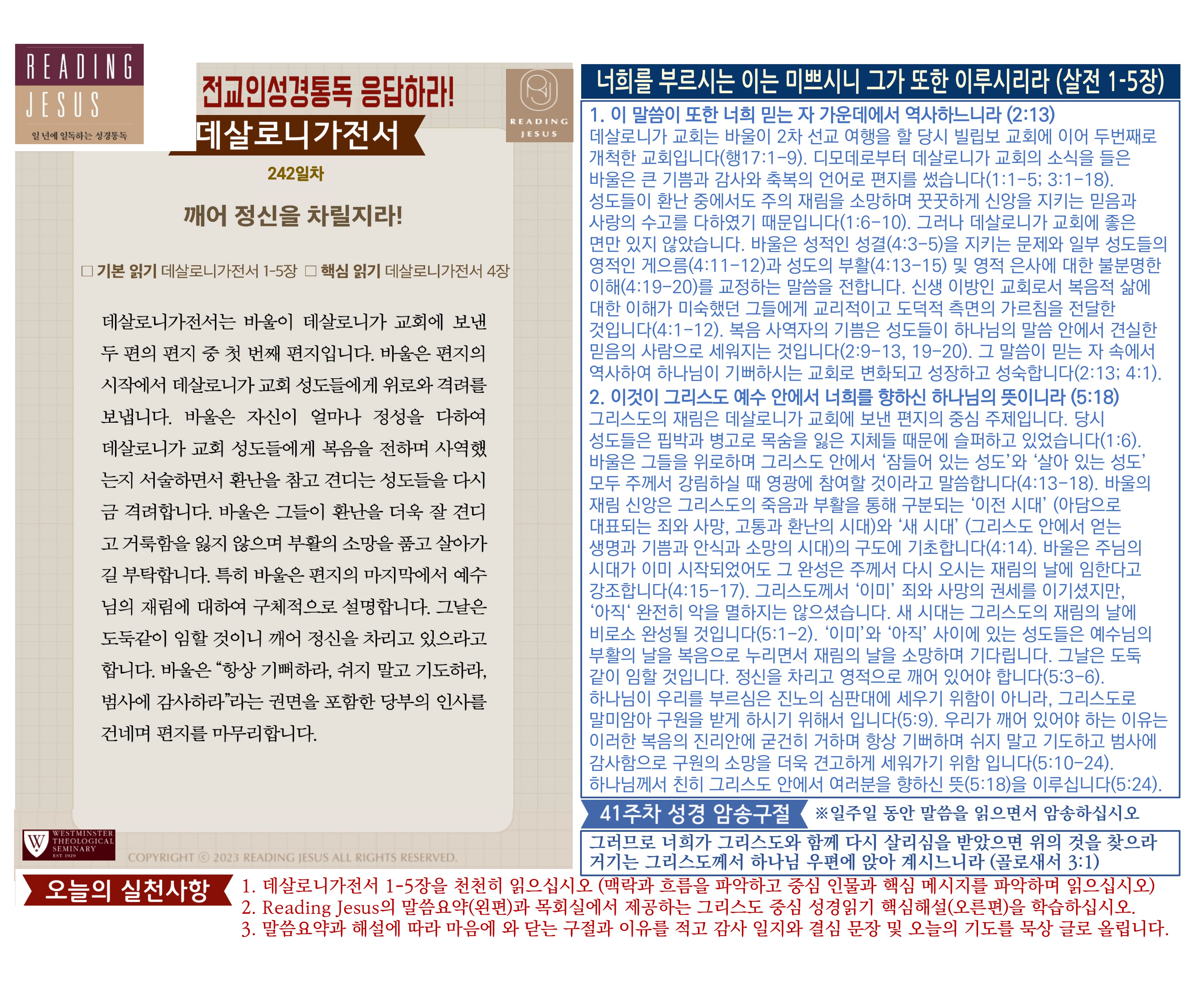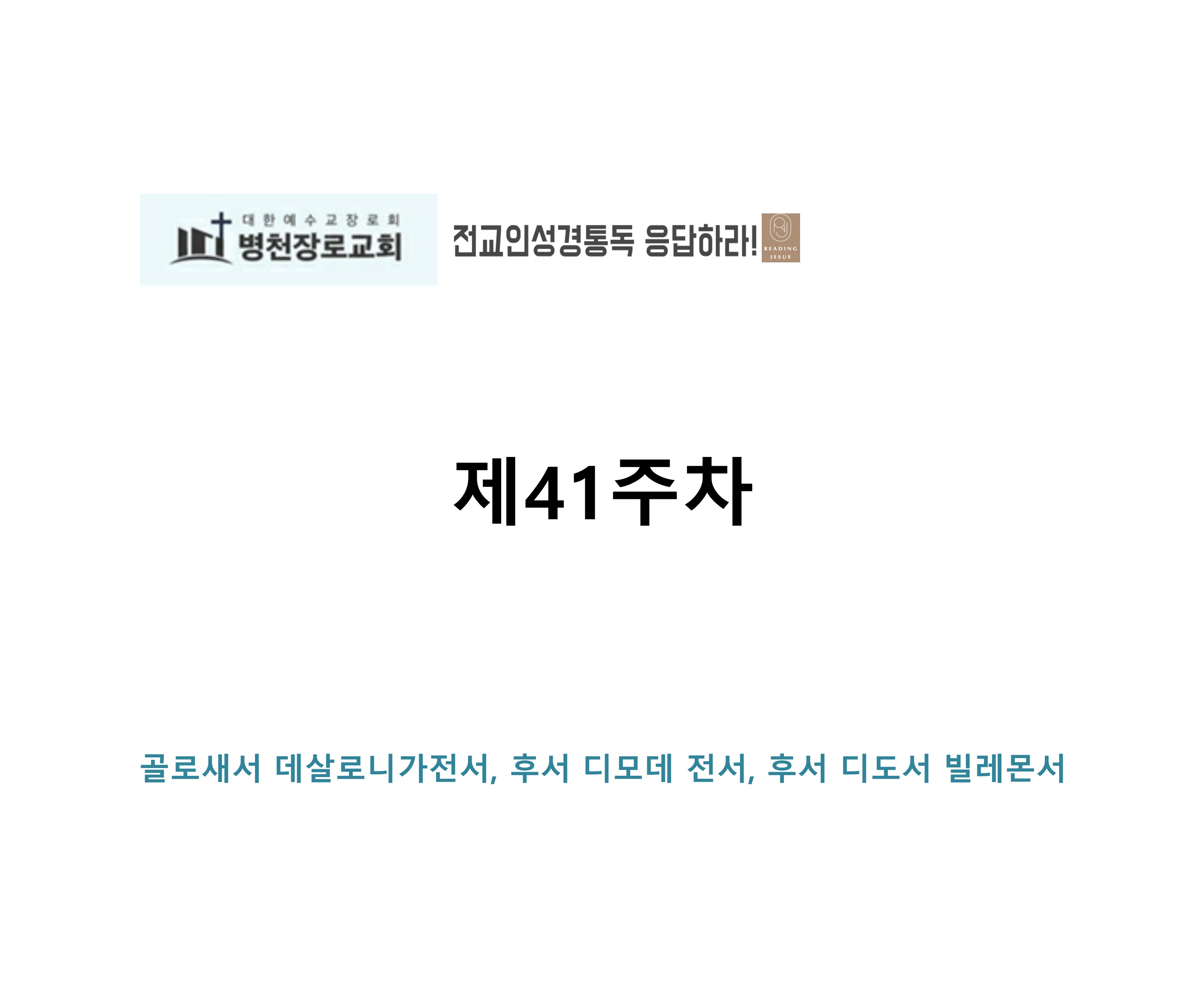 그리스도 중심 성경읽기, 리딩지저스 말씀 요약 | 41주차 : 골로새서 데살로니가전서 후서 디모데 전서 후서 디도서 빌레몬서 관리자 교재와 해설 0 1 3시간전 그리스도 중심 성경읽기, 리딩지저스 말씀 요약 | 41주차 : 골로새서 데살로니가전서 후서 디모데 전서 후서 디도서 빌레몬서 Author 1 1 Lv.78 관리자 최고관리자 370,580 (11.2%) 너희 안에 이 마음을 품으라 곧 그리스도 예수의 마음이니(빌립보서 2:5) Let this mind be in you, which was also in Christ Jesus(Philippians 2:5)