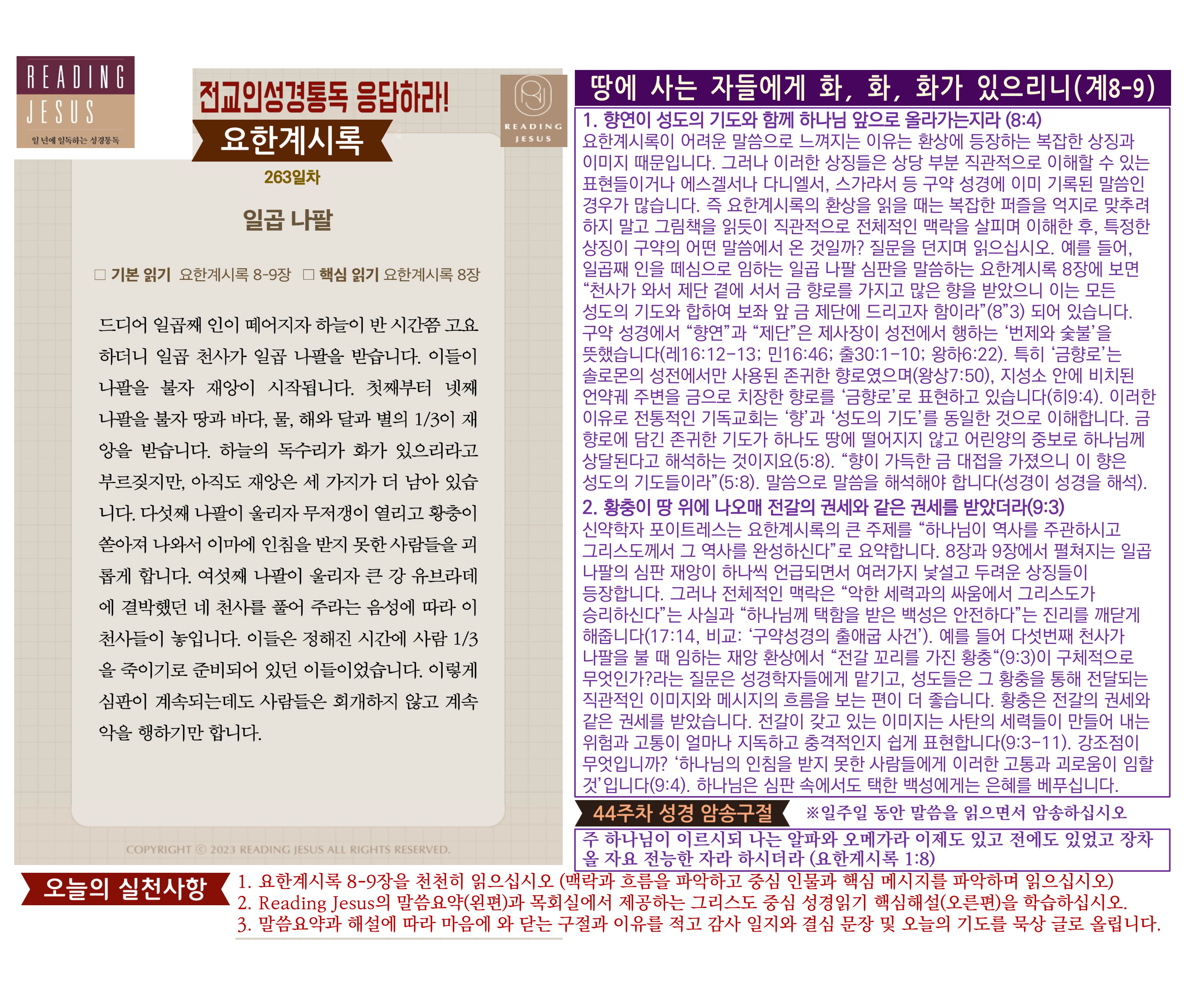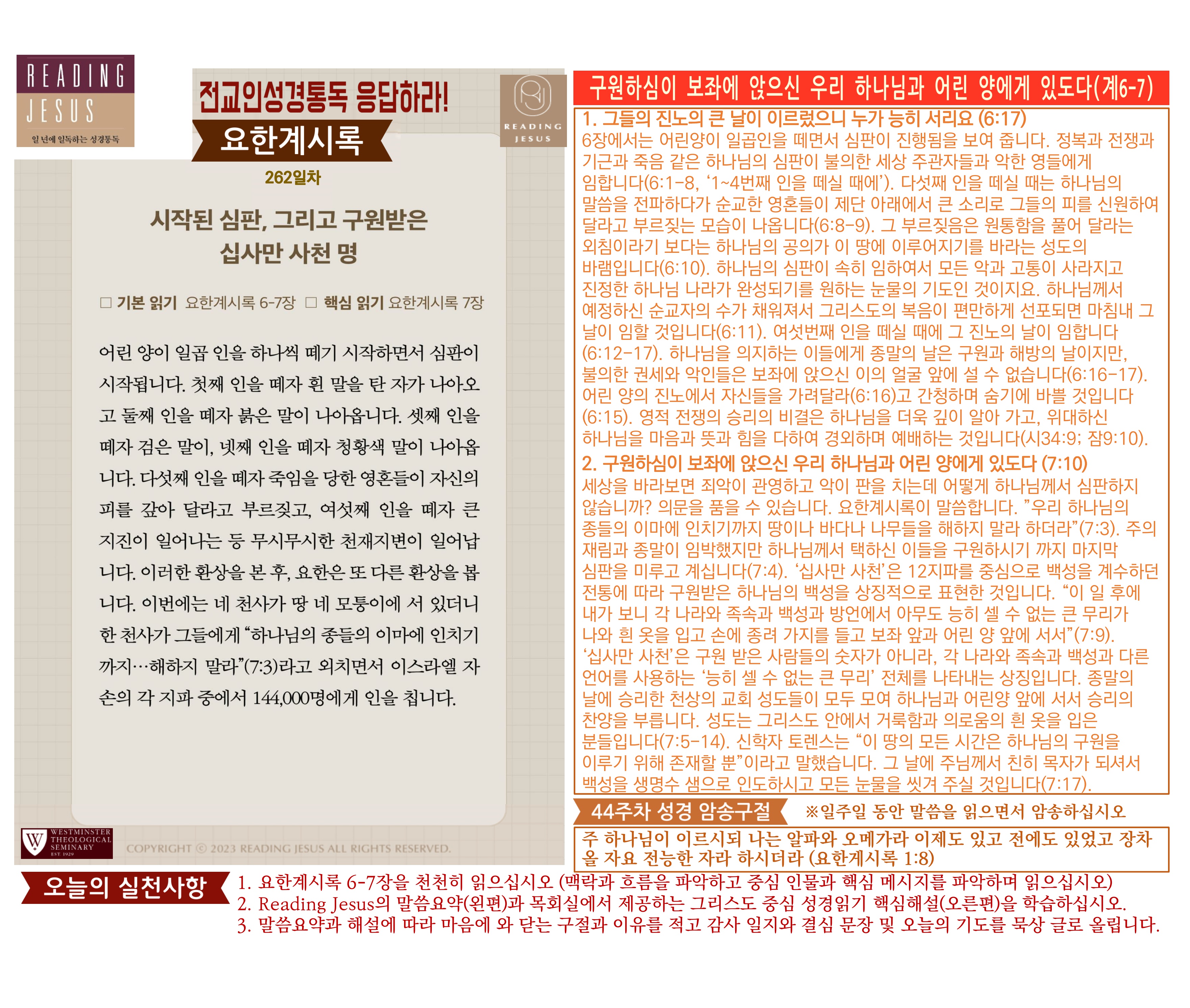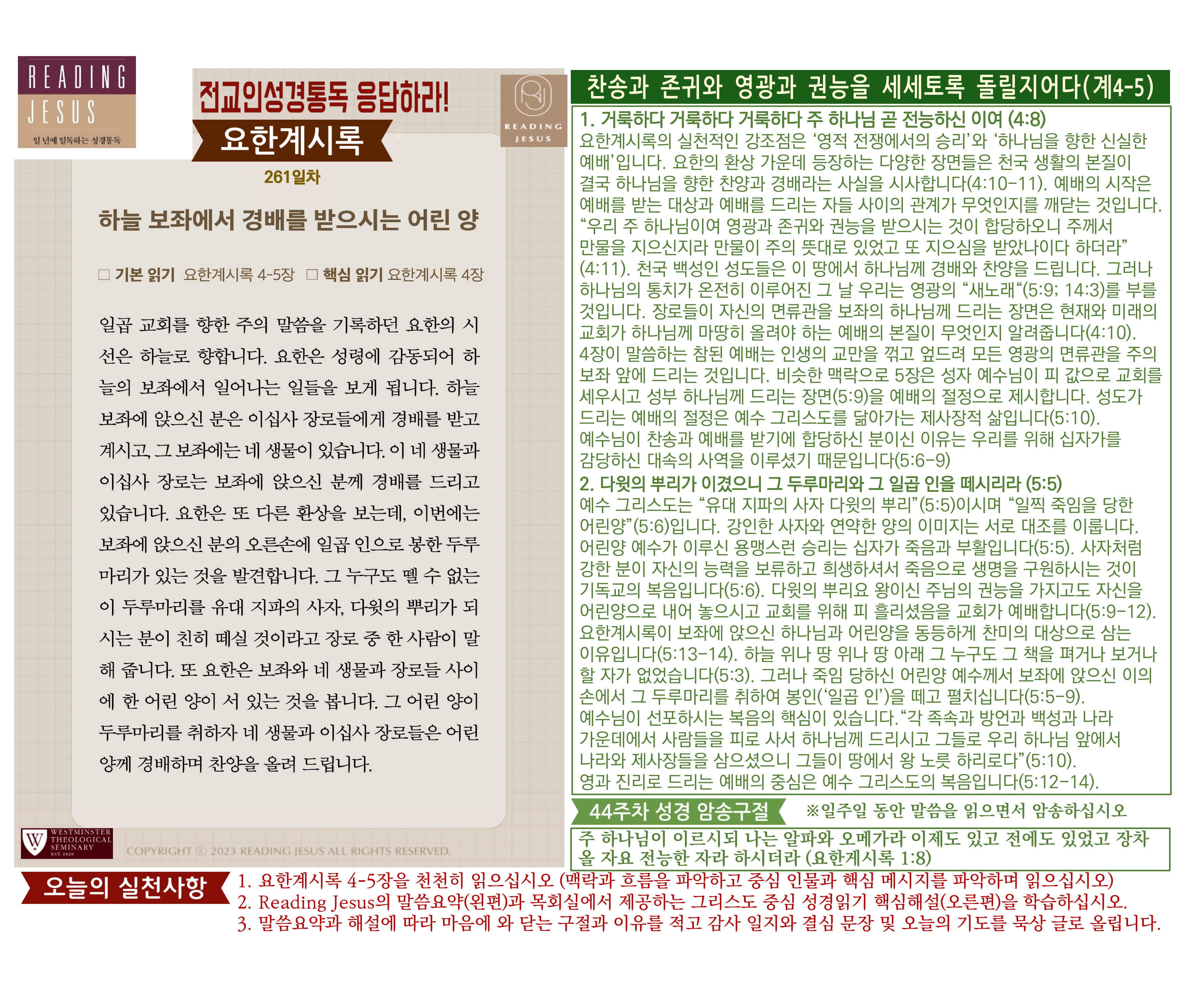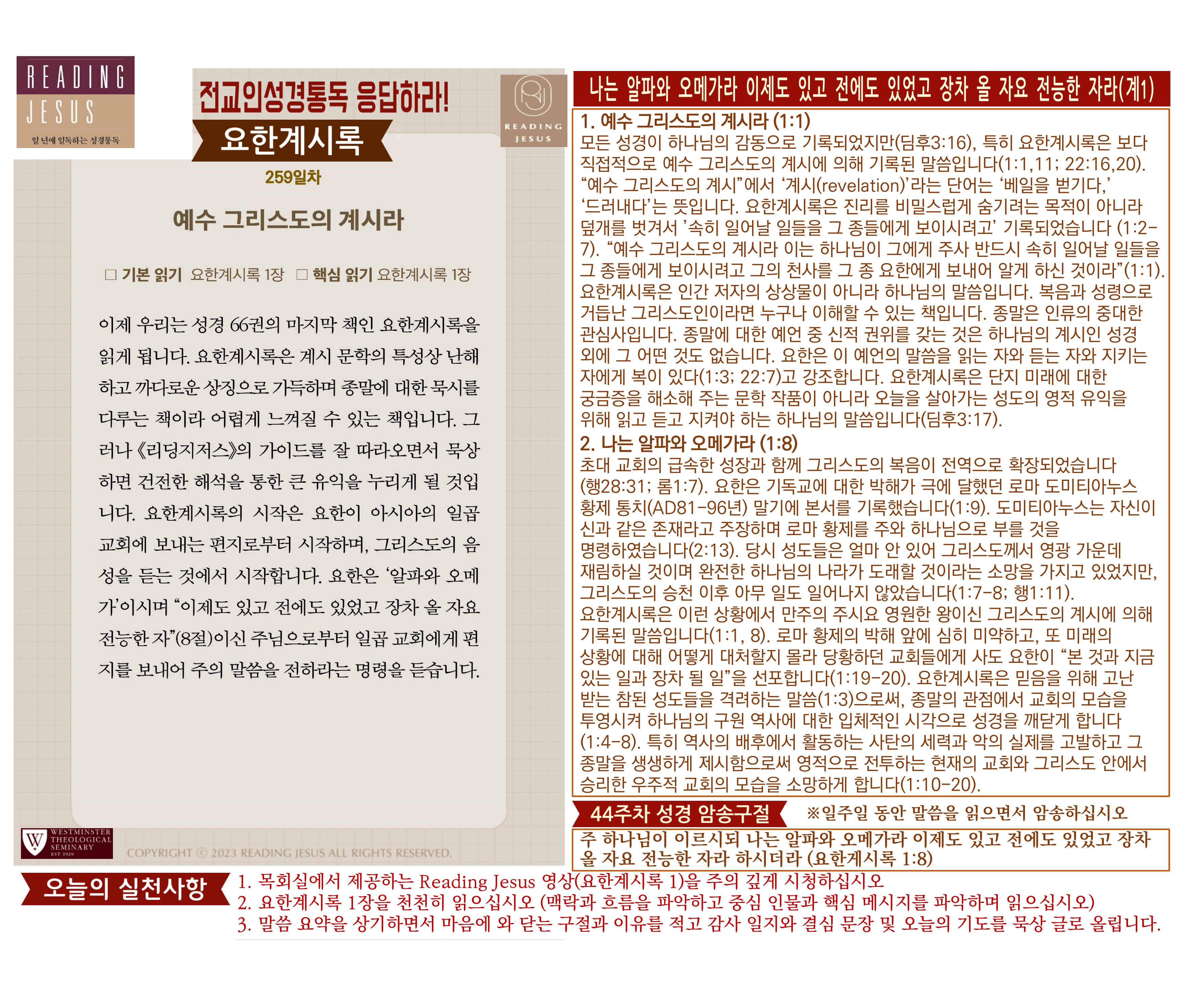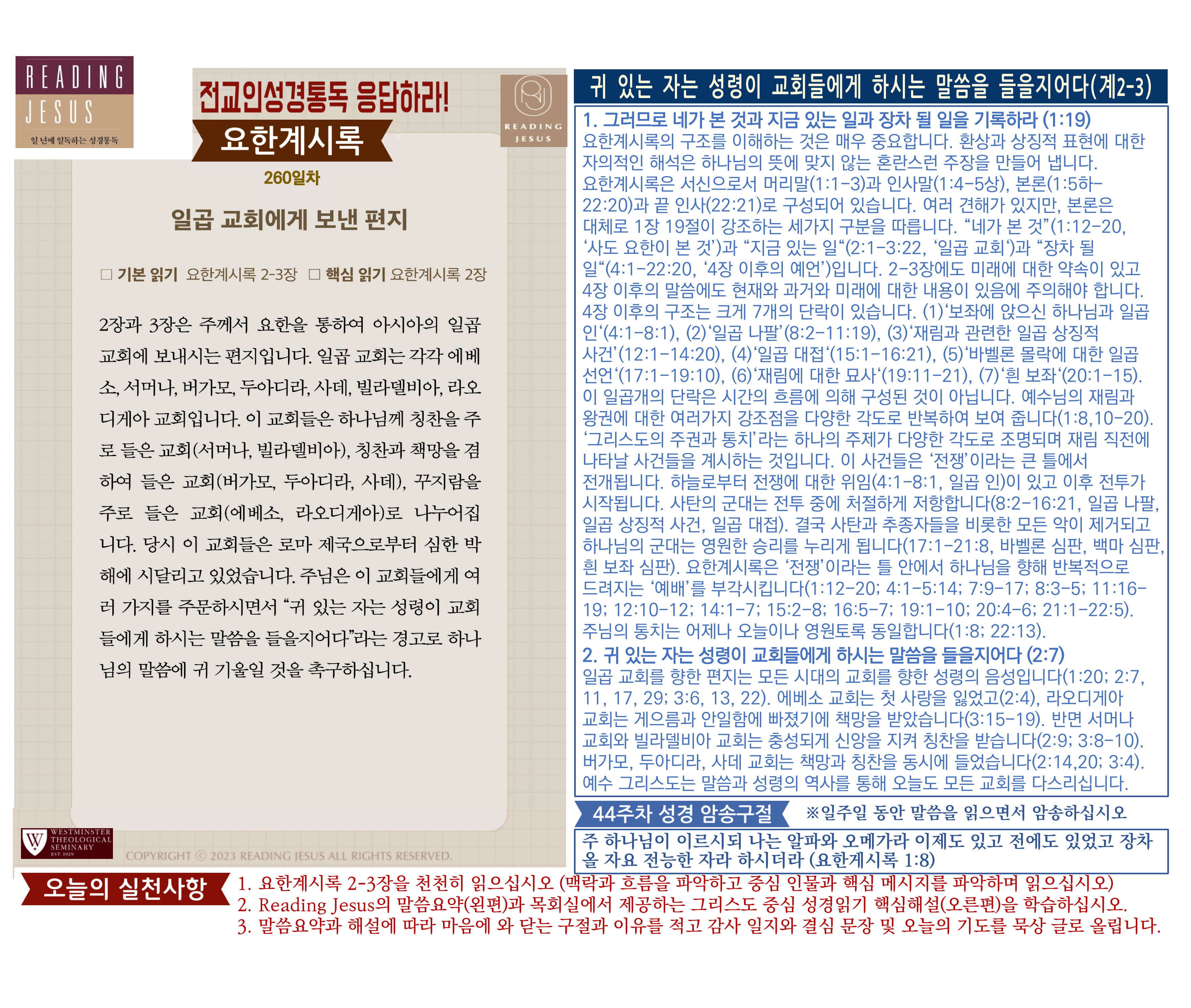 그리스도 중심 성경읽기, 리딩지저스 말씀 요약 | 44주차 : 요한계시록1 관리자 교재와 해설 0 1 3시간전 Author 1 1 Lv.78 관리자 최고관리자 370,580 (11.2%) 너희 안에 이 마음을 품으라 곧 그리스도 예수의 마음이니(빌립보서 2:5) Let this mind be in you, which was also in Christ Jesus(Philippians 2:5)