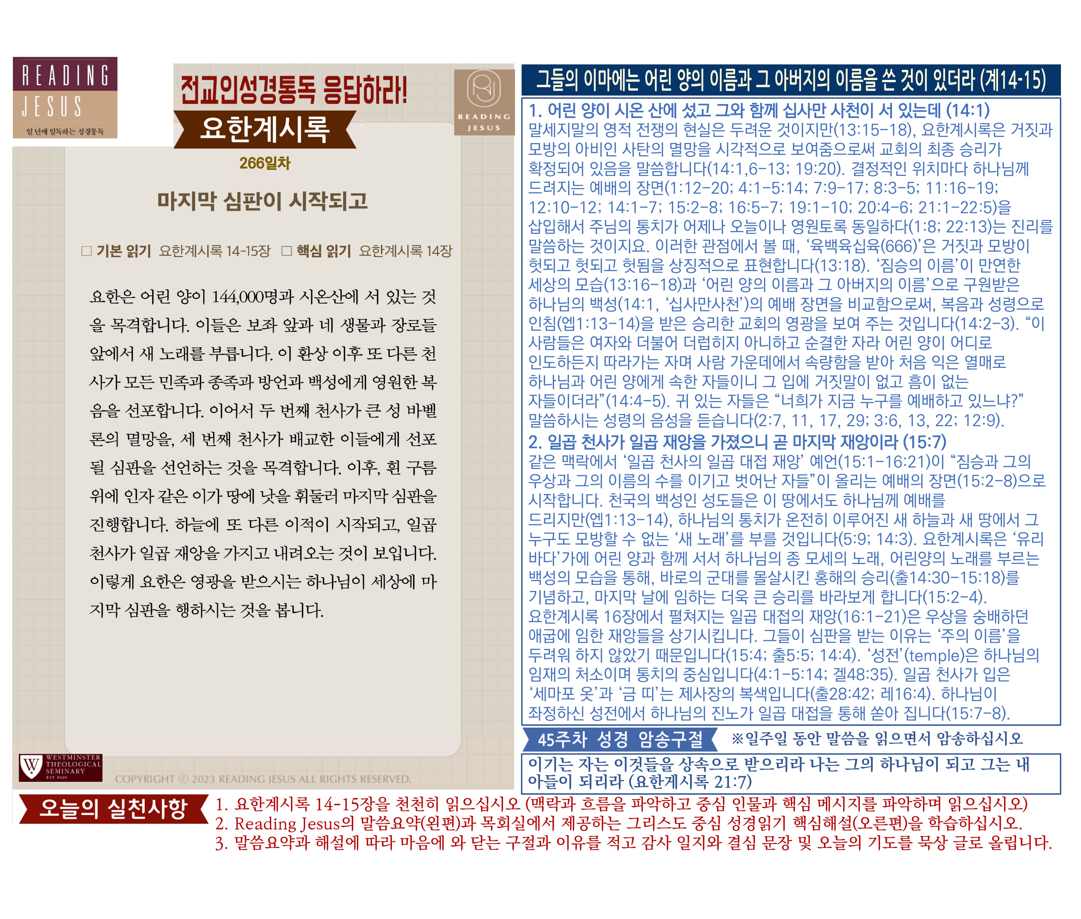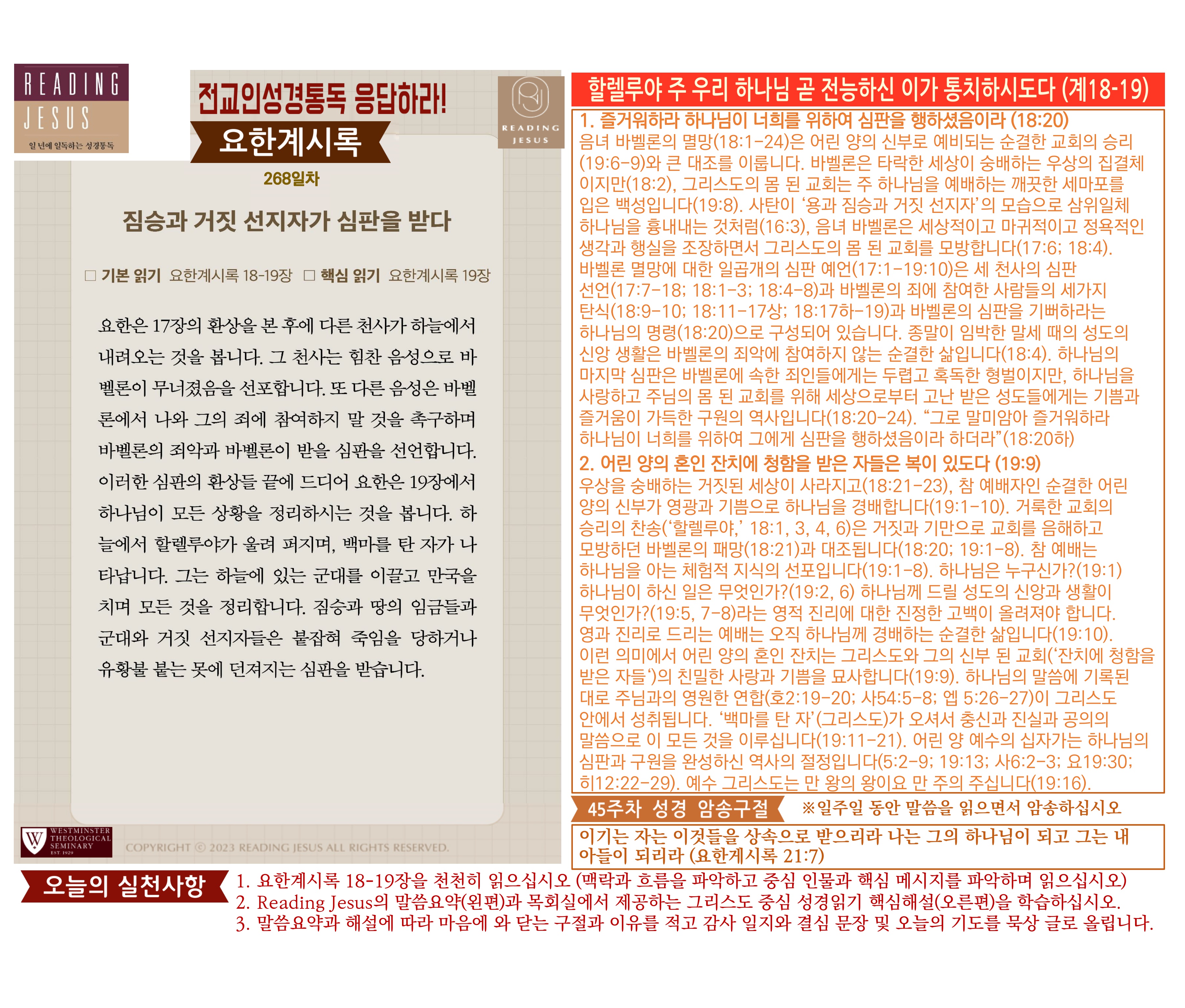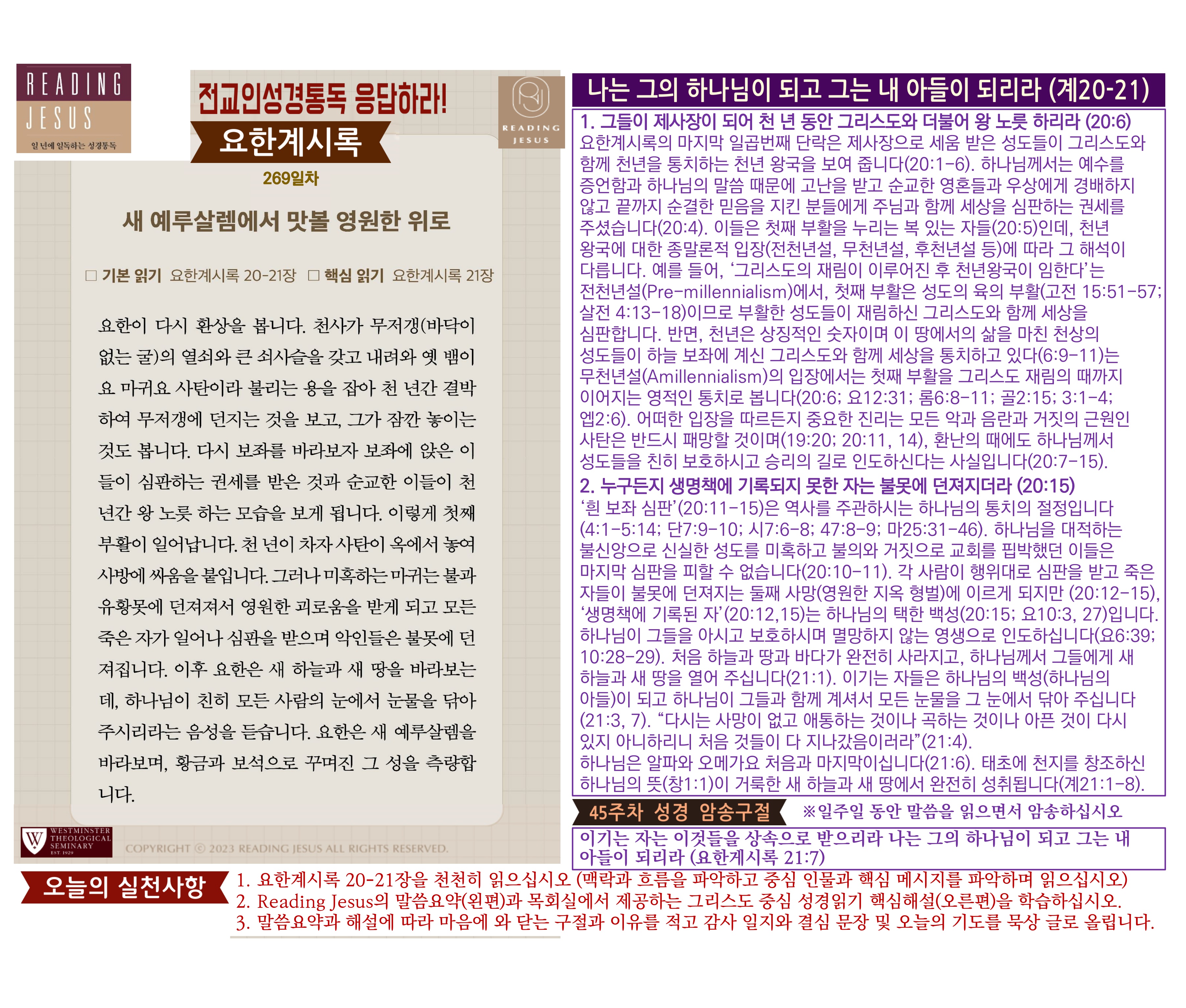 그리스도 중심 성경읽기, 리딩지저스 말씀 요약 | 45주차 : 요한계시록2 관리자 교재와 해설 0 1 2시간전 Author 1 1 Lv.78 관리자 최고관리자 370,580 (11.2%) 너희 안에 이 마음을 품으라 곧 그리스도 예수의 마음이니(빌립보서 2:5) Let this mind be in you, which was also in Christ Jesus(Philippians 2:5)
