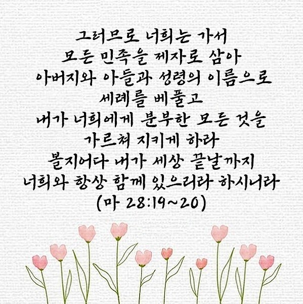 마태복음 28장 19절~20절 관리자 마태복음 0 2630 2025.06.29 05:43 Author 1 1 Lv.77 관리자 최고관리자 368,630 (88.7%) 너희 안에 이 마음을 품으라 곧 그리스도 예수의 마음이니(빌립보서 2:5) Let this mind be in you, which was also in Christ Jesus(Philippians 2:5)