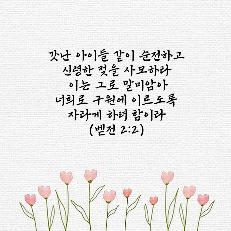 베드로전서 2장 2절 관리자 베드로전서 0 3485 2024.12.07 06:37 Author 1 1 Lv.77 관리자 최고관리자 368,630 (88.7%) 너희 안에 이 마음을 품으라 곧 그리스도 예수의 마음이니(빌립보서 2:5) Let this mind be in you, which was also in Christ Jesus(Philippians 2:5)