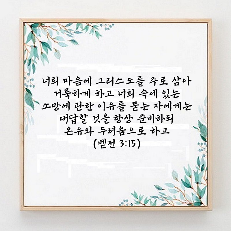 베드로전서 3장 15절 관리자 베드로전서 0 3878 2024.12.07 08:43 Author 1 1 Lv.77 관리자 최고관리자 368,630 (88.7%) 너희 안에 이 마음을 품으라 곧 그리스도 예수의 마음이니(빌립보서 2:5) Let this mind be in you, which was also in Christ Jesus(Philippians 2:5)