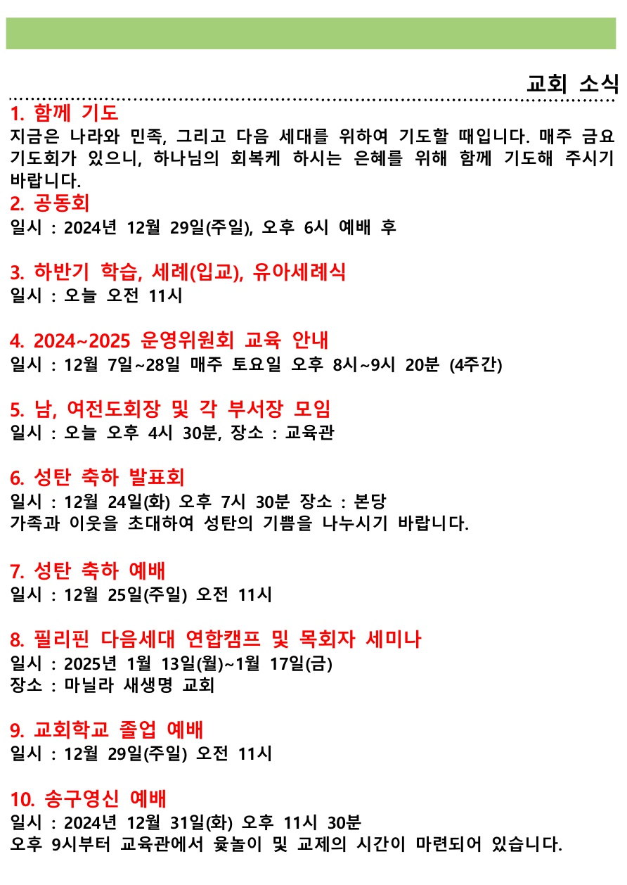 교회소식 (2024년 12월 22일 주일) 관리자 0 2444 2024.12.22 17:09 2024년 12월 22일 (주일) 교회소식입니다. Author 1 1 Lv.77 관리자 최고관리자 368,630 (88.7%) 너희 안에 이 마음을 품으라 곧 그리스도 예수의 마음이니(빌립보서 2:5) Let this mind be in you, which was also in Christ Jesus(Philippians 2:5)