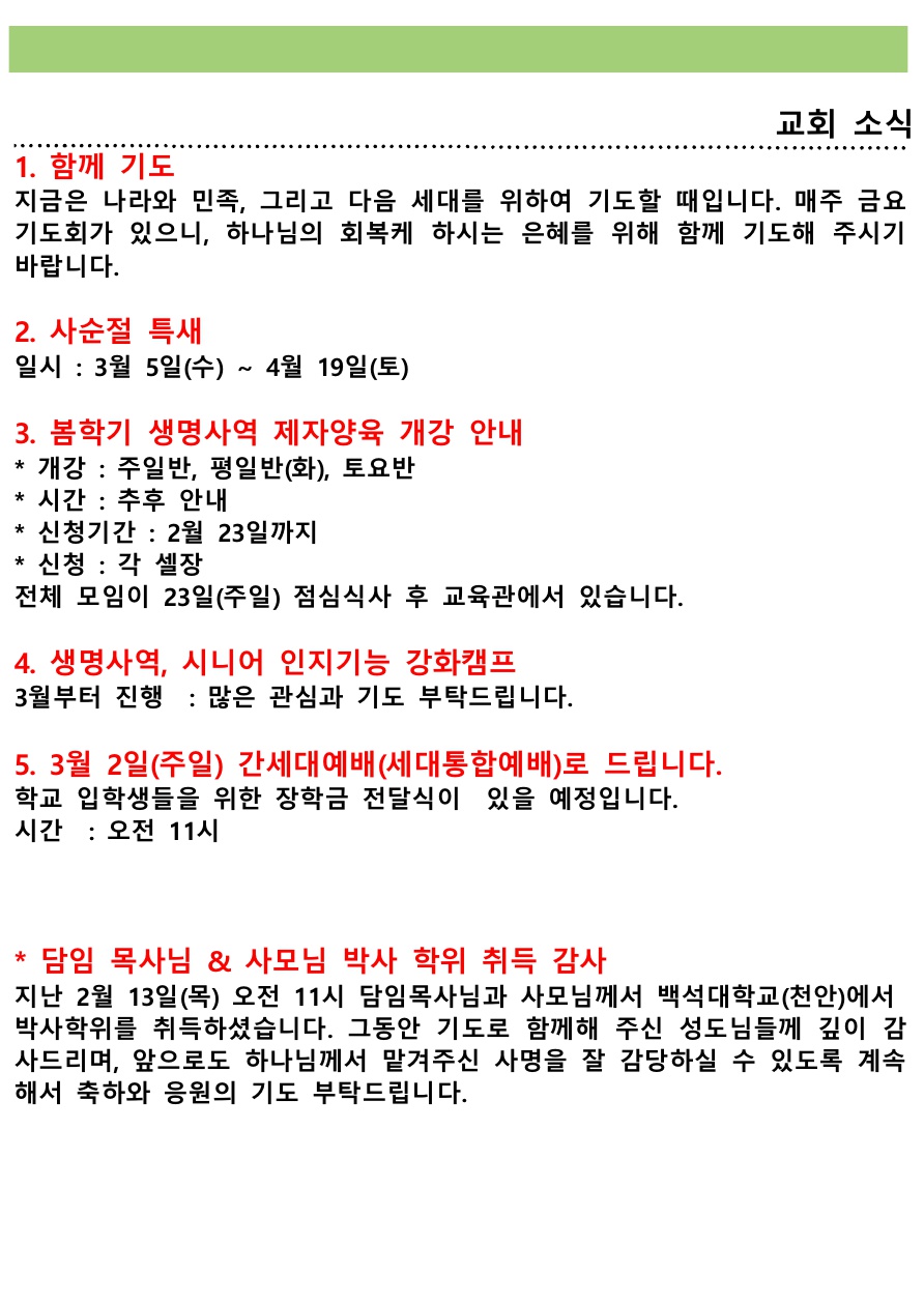 교회소식 (2025년 2월 16일 주일) 관리자 0 2263 2025.02.16 19:14 2025년 2월 16일 (주일) 교회소식입니다. Author 1 1 Lv.77 관리자 최고관리자 368,630 (88.7%) 너희 안에 이 마음을 품으라 곧 그리스도 예수의 마음이니(빌립보서 2:5) Let this mind be in you, which was also in Christ Jesus(Philippians 2:5)