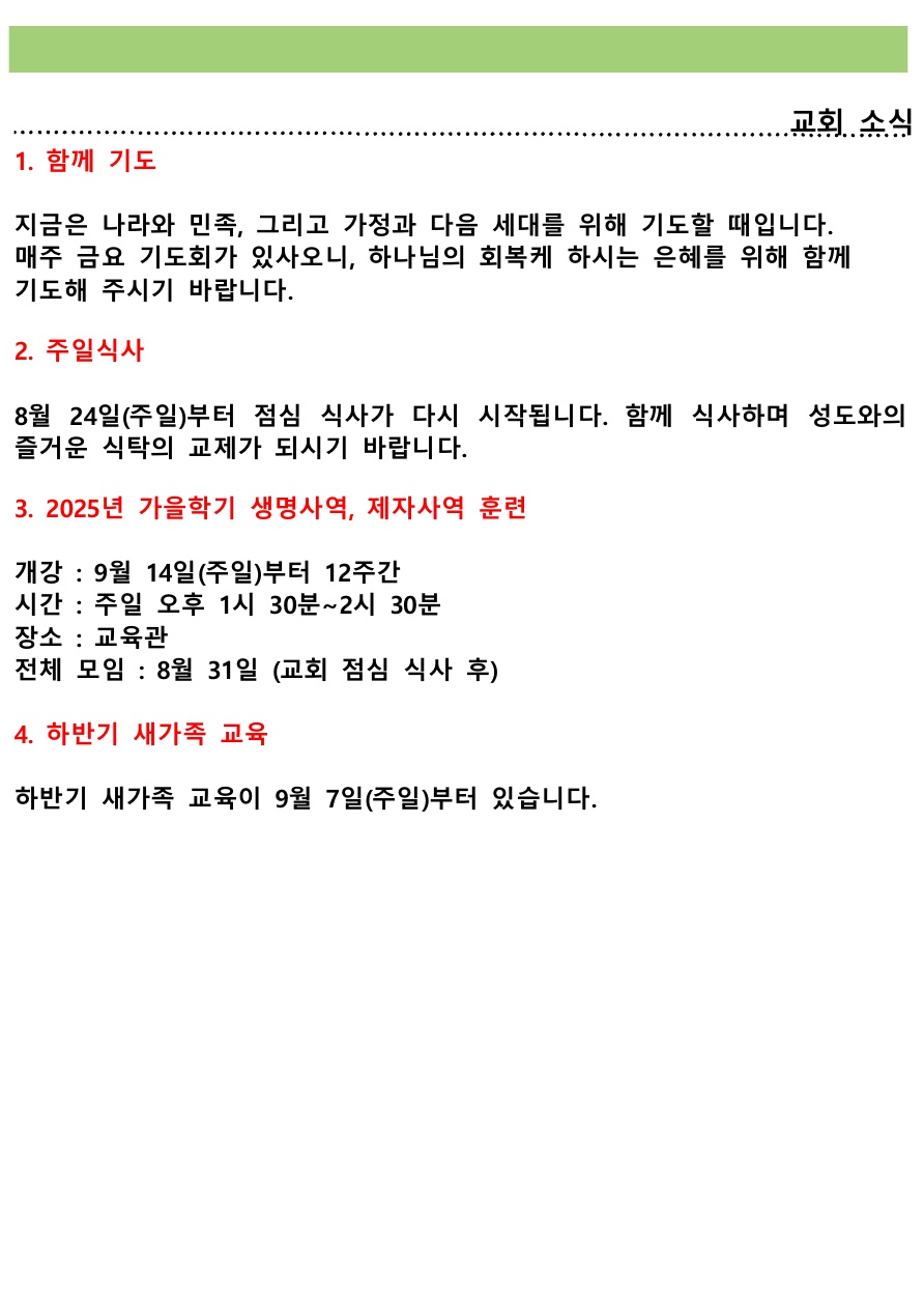 교회소식 (2025년 8월 17일 주일) 관리자 0 1440 2025.08.17 13:30 Author 1 1 Lv.77 관리자 최고관리자 367,730 (78.2%) 너희 안에 이 마음을 품으라 곧 그리스도 예수의 마음이니(빌립보서 2:5) Let this mind be in you, which was also in Christ Jesus(Philippians 2:5)