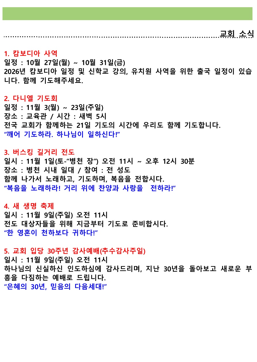 교회소식 (2025년 10월 26일 주일) 관리자 0 1117 2025.10.26 20:22 Author 1 1 Lv.77 관리자 최고관리자 367,730 (78.2%) 너희 안에 이 마음을 품으라 곧 그리스도 예수의 마음이니(빌립보서 2:5) Let this mind be in you, which was also in Christ Jesus(Philippians 2:5)