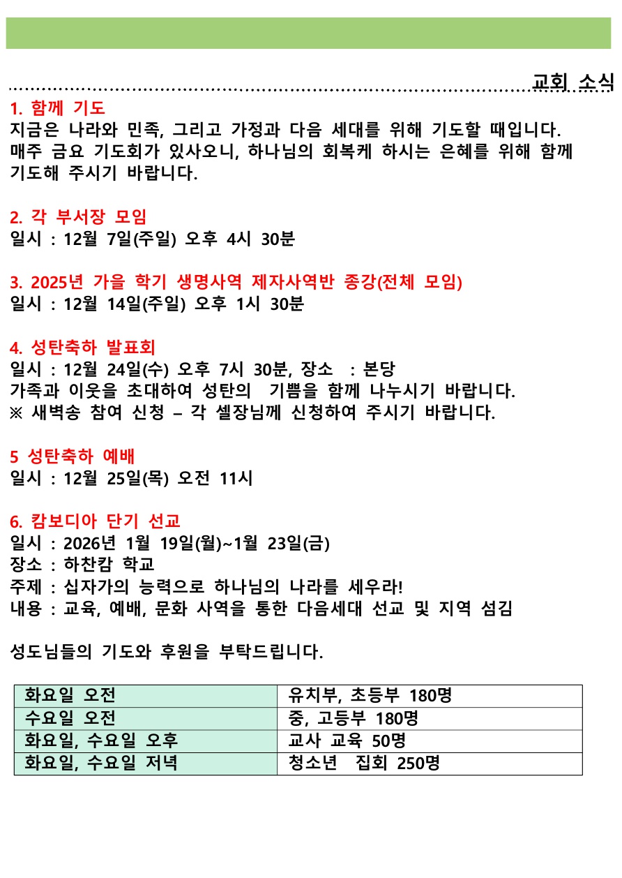 교회소식 (2025년 12월 7일 주일) 관리자 0 795 2025.12.07 19:31 Author 1 1 Lv.77 관리자 최고관리자 368,630 (88.7%) 너희 안에 이 마음을 품으라 곧 그리스도 예수의 마음이니(빌립보서 2:5) Let this mind be in you, which was also in Christ Jesus(Philippians 2:5)