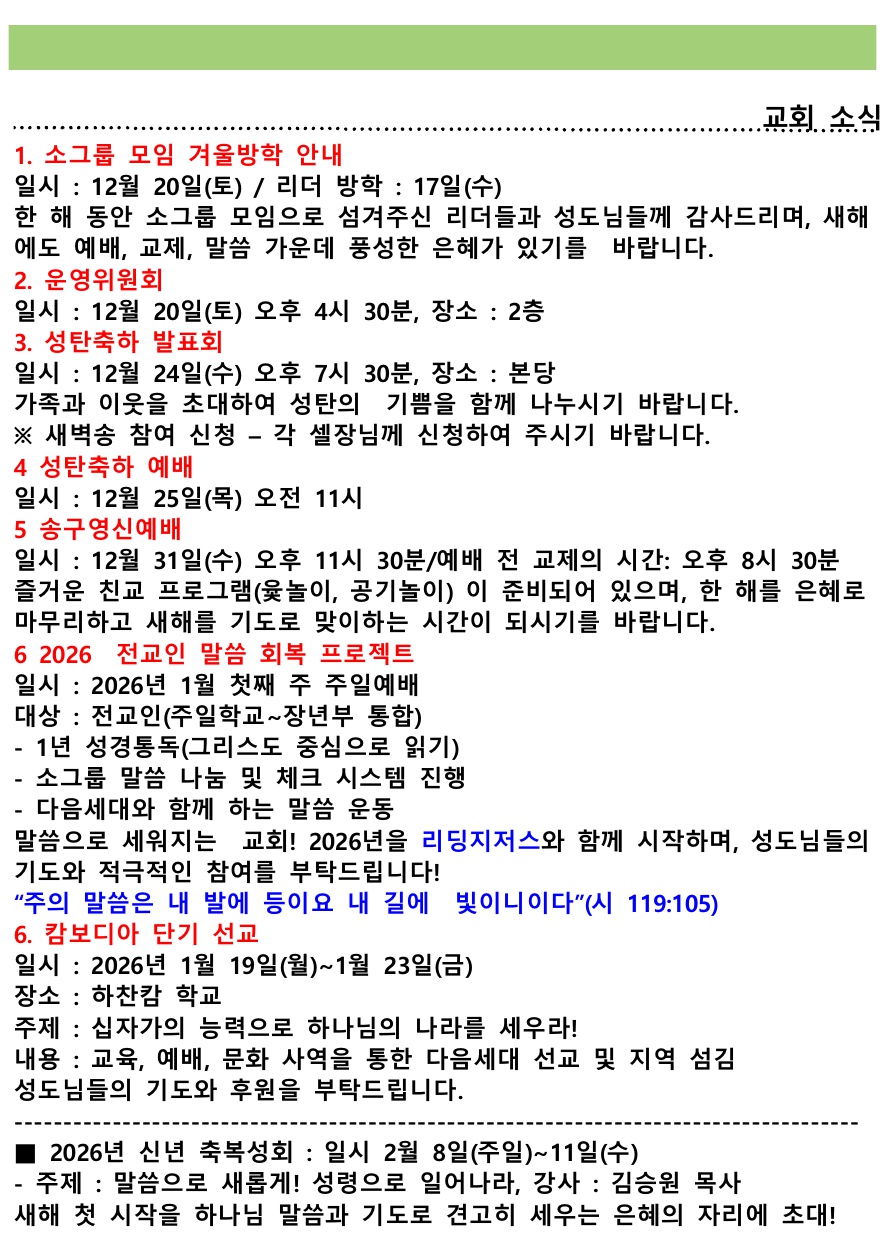 교회소식 (2025년 12월 14일 주일) 관리자 0 774 2025.12.14 15:46 Author 1 1 Lv.77 관리자 최고관리자 367,730 (78.2%) 너희 안에 이 마음을 품으라 곧 그리스도 예수의 마음이니(빌립보서 2:5) Let this mind be in you, which was also in Christ Jesus(Philippians 2:5)