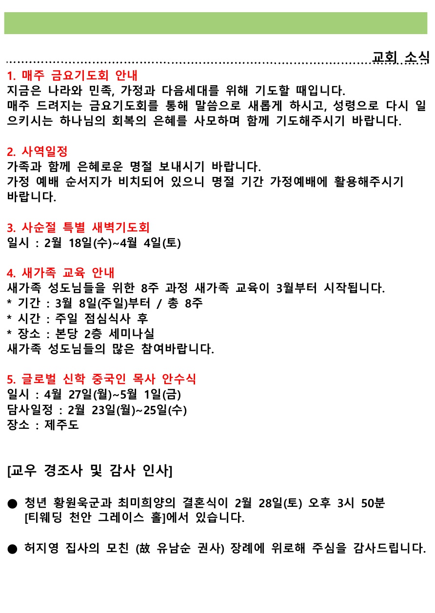 교회소식 (2026년 2월 15일 주일) 관리자 0 382 02.16 03:12 Author 1 1 Lv.77 관리자 최고관리자 368,630 (88.7%) 너희 안에 이 마음을 품으라 곧 그리스도 예수의 마음이니(빌립보서 2:5) Let this mind be in you, which was also in Christ Jesus(Philippians 2:5)