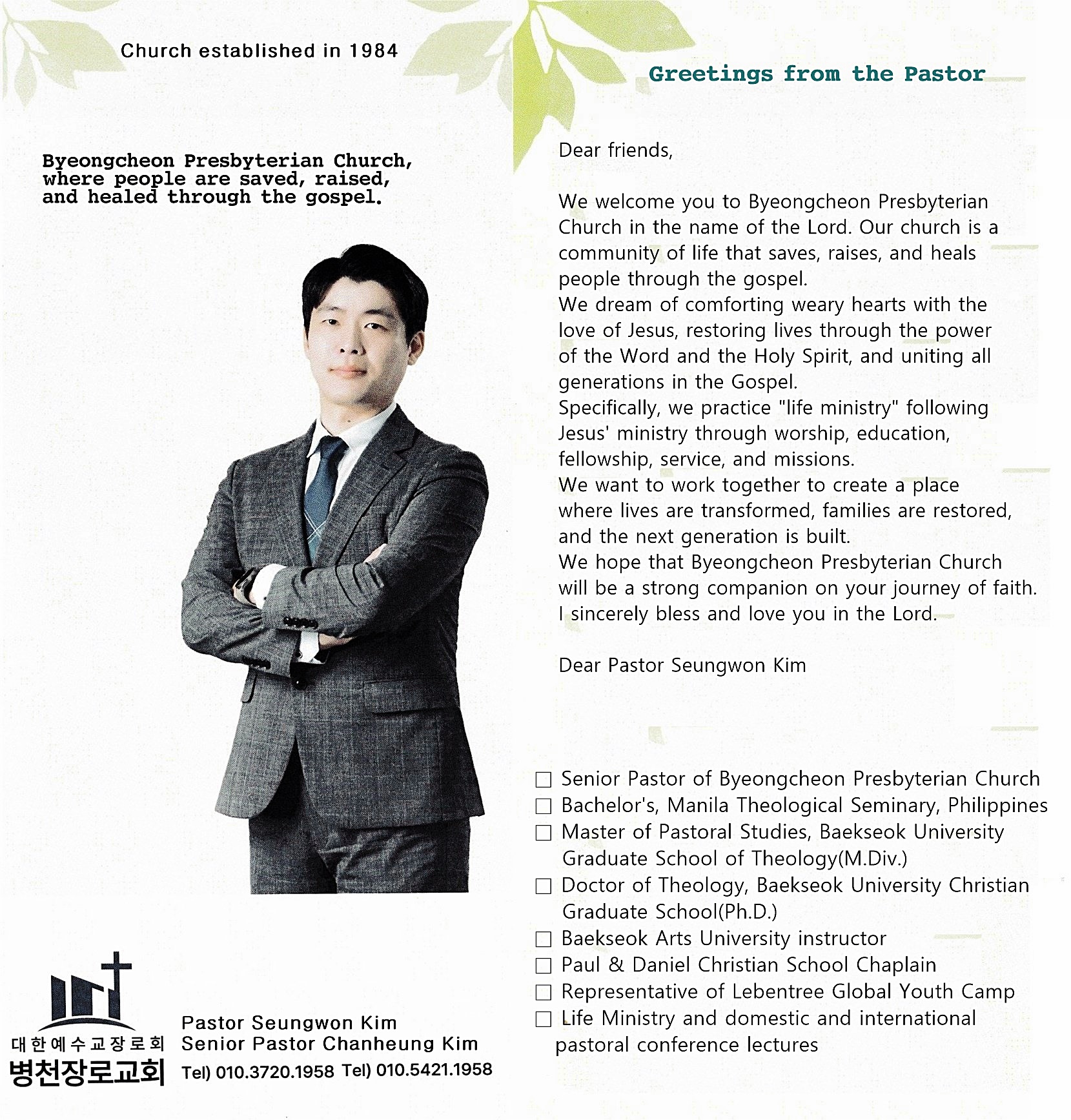 교회 소개 리플렛(영문-English) 관리자 공지 0 1597 2025.08.15 19:51 Author 1 1 Lv.77 관리자 최고관리자 368,630 (88.7%) 너희 안에 이 마음을 품으라 곧 그리스도 예수의 마음이니(빌립보서 2:5) Let this mind be in you, which was also in Christ Jesus(Philippians 2:5)