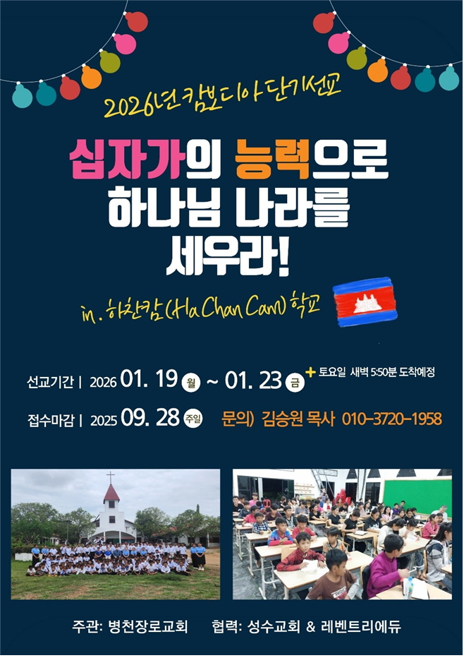 2026 캄보디아 단기선교 관리자 선교사역 0 2172 2025.09.14 05:46 십자가의 능력으로 하나님의 나라를 세우라! 2026년 1월 19일(월)~1월 23일(금) Author 1 1 Lv.77 관리자 최고관리자 368,630 (88.7%) 너희 안에 이 마음을 품으라 곧 그리스도 예수의 마음이니(빌립보서 2:5) Let this mind be in you, which was also in Christ Jesus(Philippians 2:5)