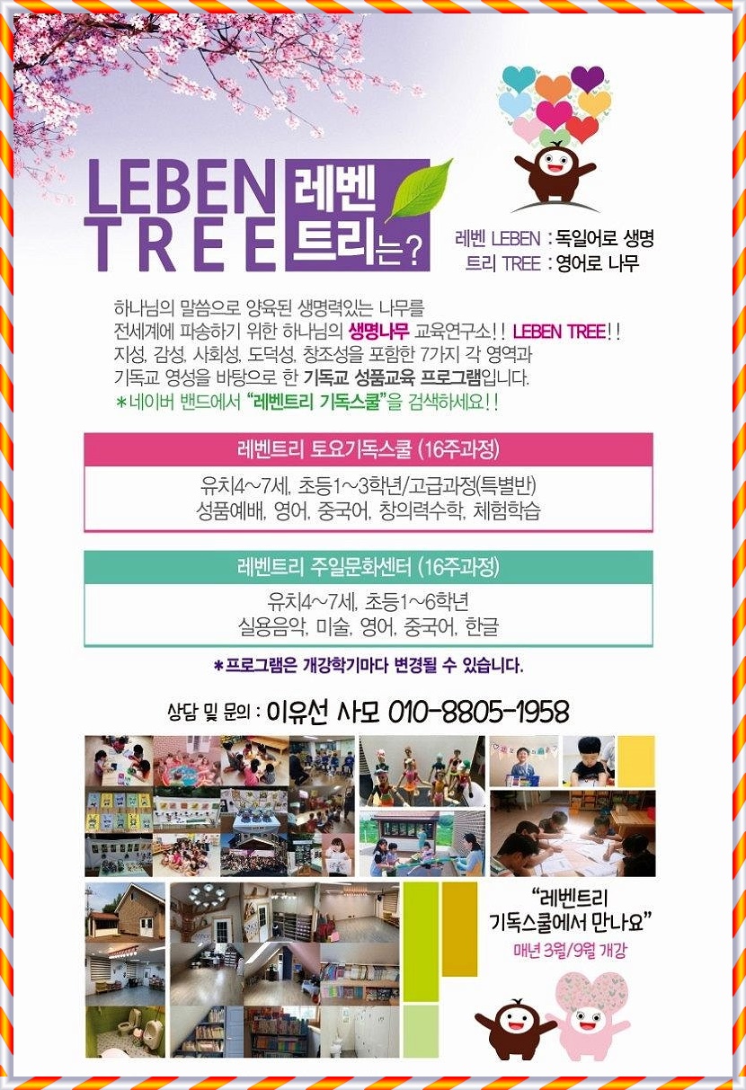 레벤트리를 소개합니다. 병천교회 레벤트리 공통 0 2771 2022.06.25 19:19 레벤 (LEBEN) 은 독일어로 생명, 트리 (TREE) 는 영어로 나무를 뜻합니다. Author 1 0 Lv.1 병천교회 최고관리자 0 (0%) 너희도 그들 중에서 예수 그리스도의 것으로 부르심을 받은 자니라. And you also are among those who are called to belong to Jesus Christ. (롬 1:6 - Rm 1:6)