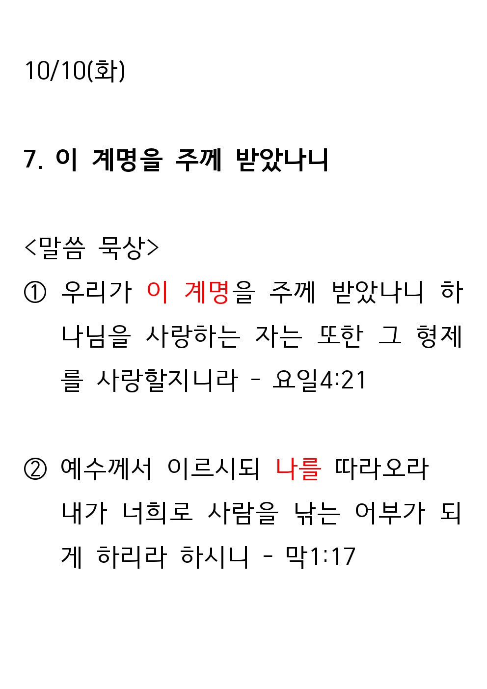 2023 새생명 축제 전 7일차 말씀 (10월 10일 - 화) : 이 계명을 주께 받았나니 병천교회 0 2245 2023.10.13 17:42 2023 새생명 축제 전 7일차 말씀 (10월 10일 - 화) : 이 계명을 주께 받았나니 Author 1 0 Lv.1 병천교회 최고관리자 0 (0%) 너희도 그들 중에서 예수 그리스도의 것으로 부르심을 받은 자니라. And you also are among those who are called to belong to Jesus Christ. (롬 1:6 - Rm 1:6)