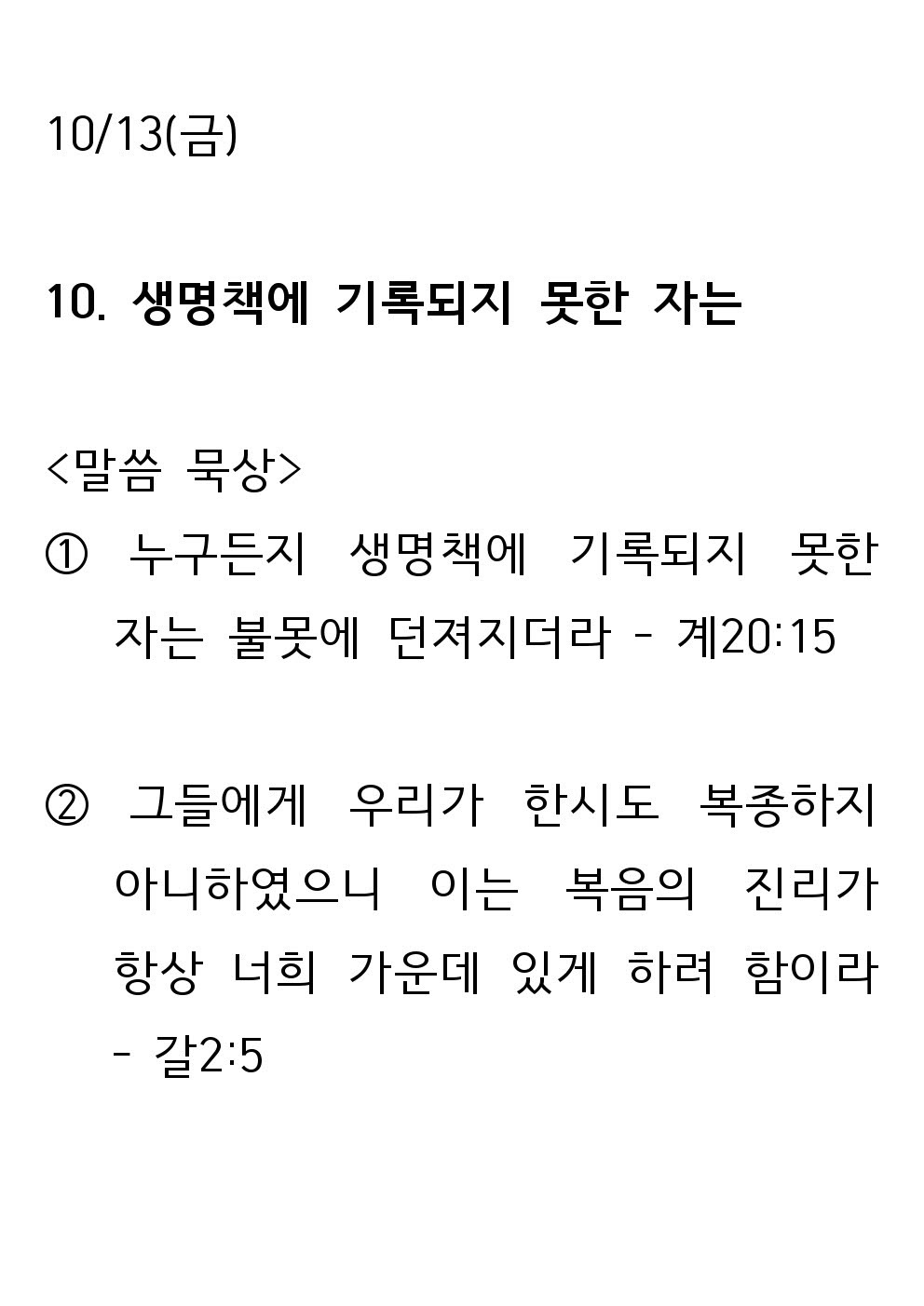 2023 새생명 축제 전 10일차 말씀 (10월 13일 - 금) : 생명책에 기록되지 못한 자는 병천교회 0 2811 2023.10.13 17:52 2023 새생명 축제 전 10일차 말씀 (10월 13일 - 금) : 생명책에 기록되지 못한 자는 Author 1 0 Lv.1 병천교회 최고관리자 0 (0%) 너희도 그들 중에서 예수 그리스도의 것으로 부르심을 받은 자니라. And you also are among those who are called to belong to Jesus Christ. (롬 1:6 - Rm 1:6)