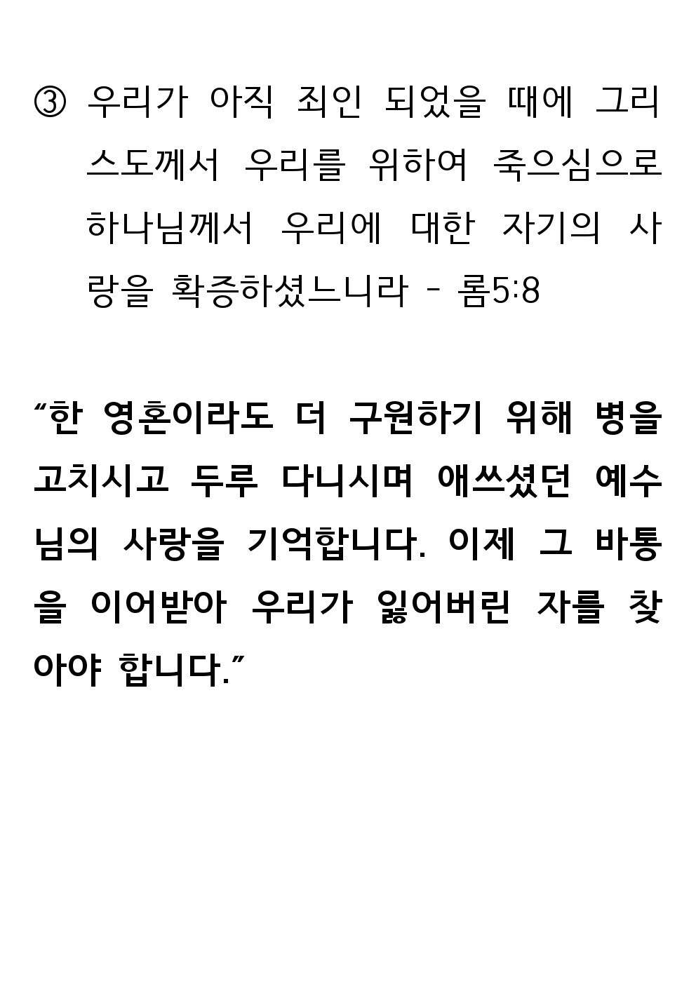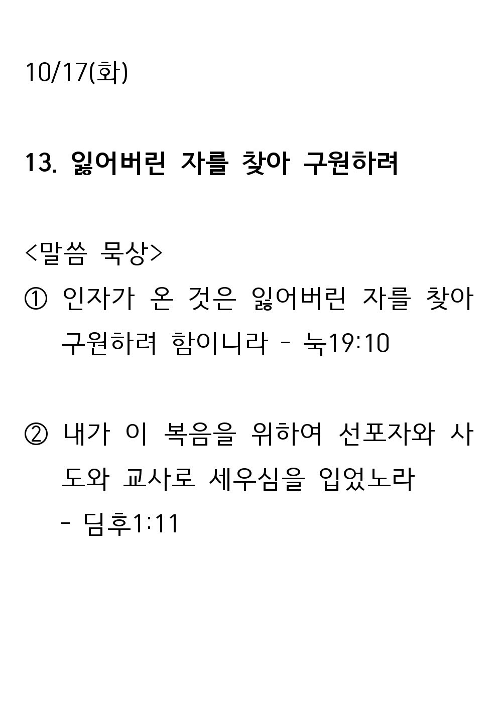 2023 새생명 축제 전 12일차 말씀 (10월 17일 - 화) : 잃어버린 자를 찾아 구원하려 병천교회 0 2234 2023.10.17 07:47 2023 새생명 축제 전 12일차 말씀 (10월 17일 - 화) : 잃어버린 자를 찾아 구원하려 Author 1 0 Lv.1 병천교회 최고관리자 0 (0%) 너희도 그들 중에서 예수 그리스도의 것으로 부르심을 받은 자니라. And you also are among those who are called to belong to Jesus Christ. (롬 1:6 - Rm 1:6)