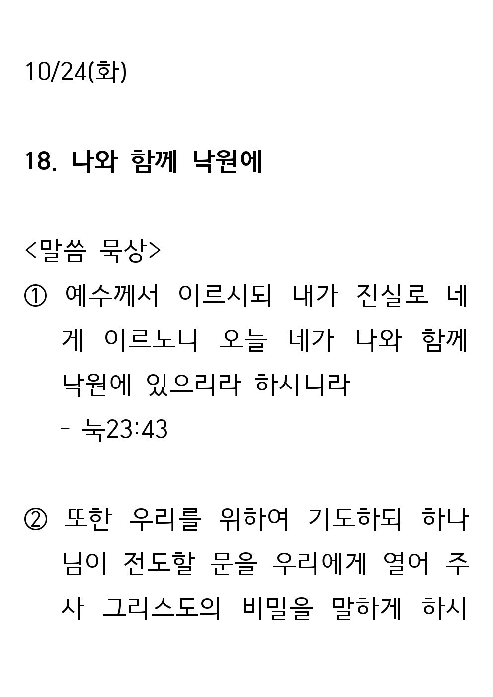 2023 새생명 축제 전 17일차 말씀 (10월 24일 - 화) : 나와 함께 낙원에 병천교회 0 2350 2023.10.25 02:48 2023 새생명 축제 전 17일차 말씀 (10월 24일 - 화) : 나와 함께 낙원에 Author 1 0 Lv.1 병천교회 최고관리자 0 (0%) 너희도 그들 중에서 예수 그리스도의 것으로 부르심을 받은 자니라. And you also are among those who are called to belong to Jesus Christ. (롬 1:6 - Rm 1:6)