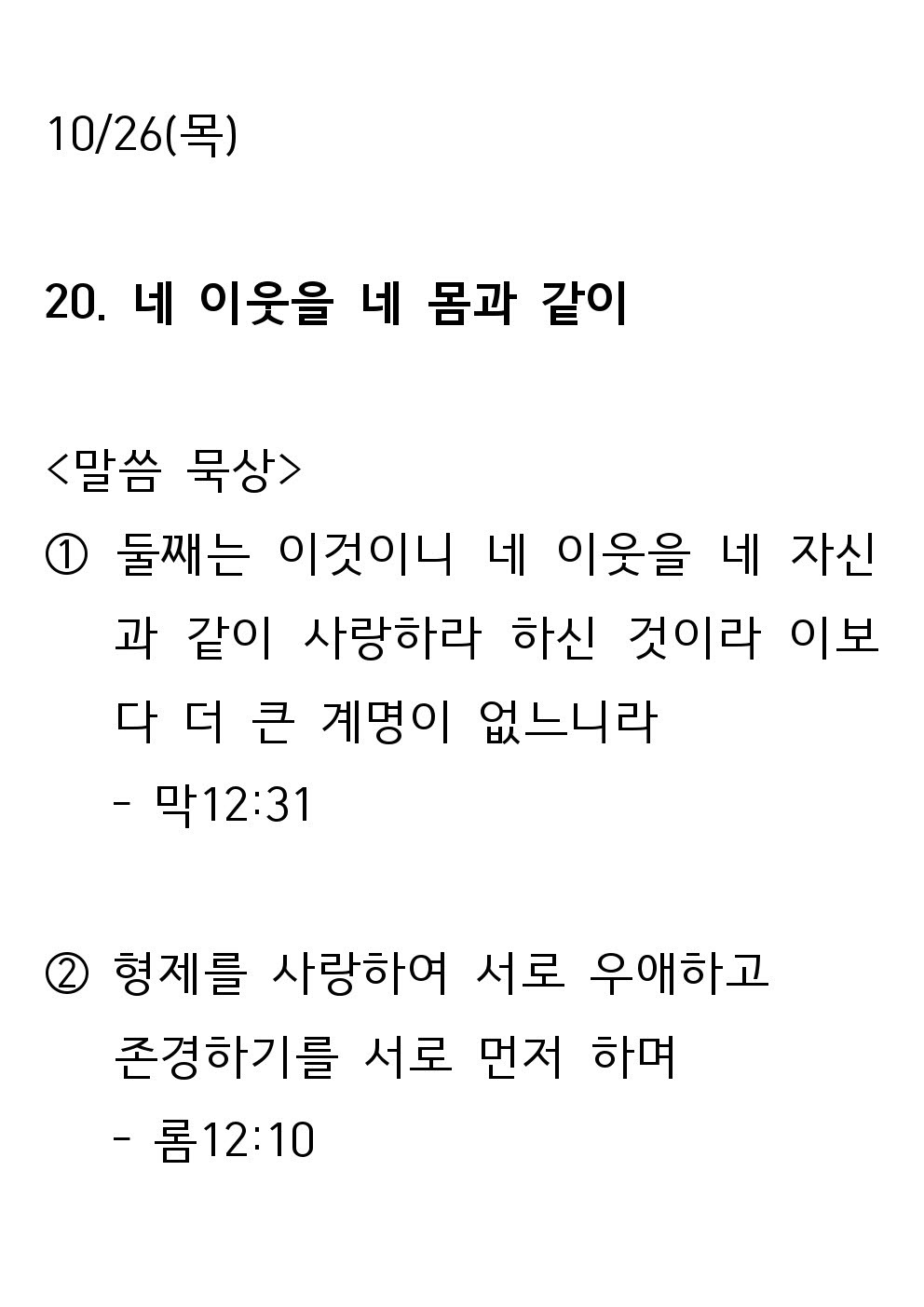 2023 새생명 축제 전 19일차 말씀 (10월 26일 - 목) : 네 이웃을 네 몸과 같이 병천교회 0 2331 2023.10.27 04:24 2023 새생명 축제 전 19일차 말씀 (10월 26일 - 목) : 네 이웃을 네 몸과 같이 Author 1 0 Lv.1 병천교회 최고관리자 0 (0%) 너희도 그들 중에서 예수 그리스도의 것으로 부르심을 받은 자니라. And you also are among those who are called to belong to Jesus Christ. (롬 1:6 - Rm 1:6)