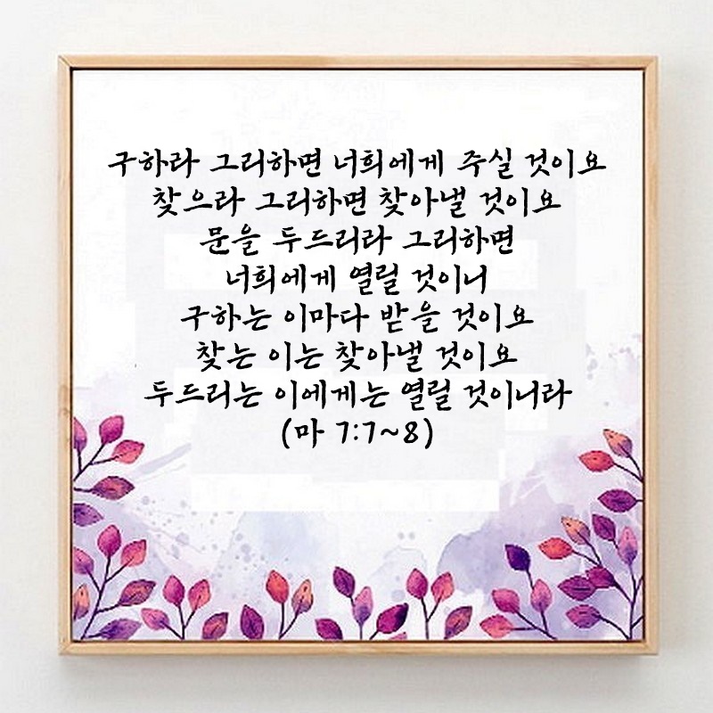 마태복음 7장 7절~8절 관리자 마태복음 0 1721 2025.09.28 02:55 Author 1 1 Lv.77 관리자 최고관리자 367,730 (78.2%) 너희 안에 이 마음을 품으라 곧 그리스도 예수의 마음이니(빌립보서 2:5) Let this mind be in you, which was also in Christ Jesus(Philippians 2:5)