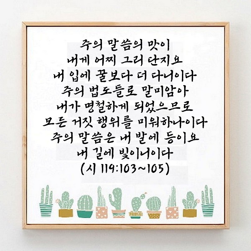 시편 119편 103절~105절 관리자 시편 0 4257 2024.12.07 05:53 Author 1 1 Lv.77 관리자 최고관리자 368,430 (86.3%) 너희 안에 이 마음을 품으라 곧 그리스도 예수의 마음이니(빌립보서 2:5) Let this mind be in you, which was also in Christ Jesus(Philippians 2:5)
