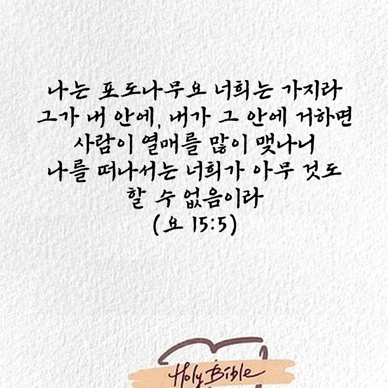 요한복음 15장 5절 관리자 요한복음 0 4090 2024.12.07 06:17 Author 1 1 Lv.77 관리자 최고관리자 367,730 (78.2%) 너희 안에 이 마음을 품으라 곧 그리스도 예수의 마음이니(빌립보서 2:5) Let this mind be in you, which was also in Christ Jesus(Philippians 2:5)