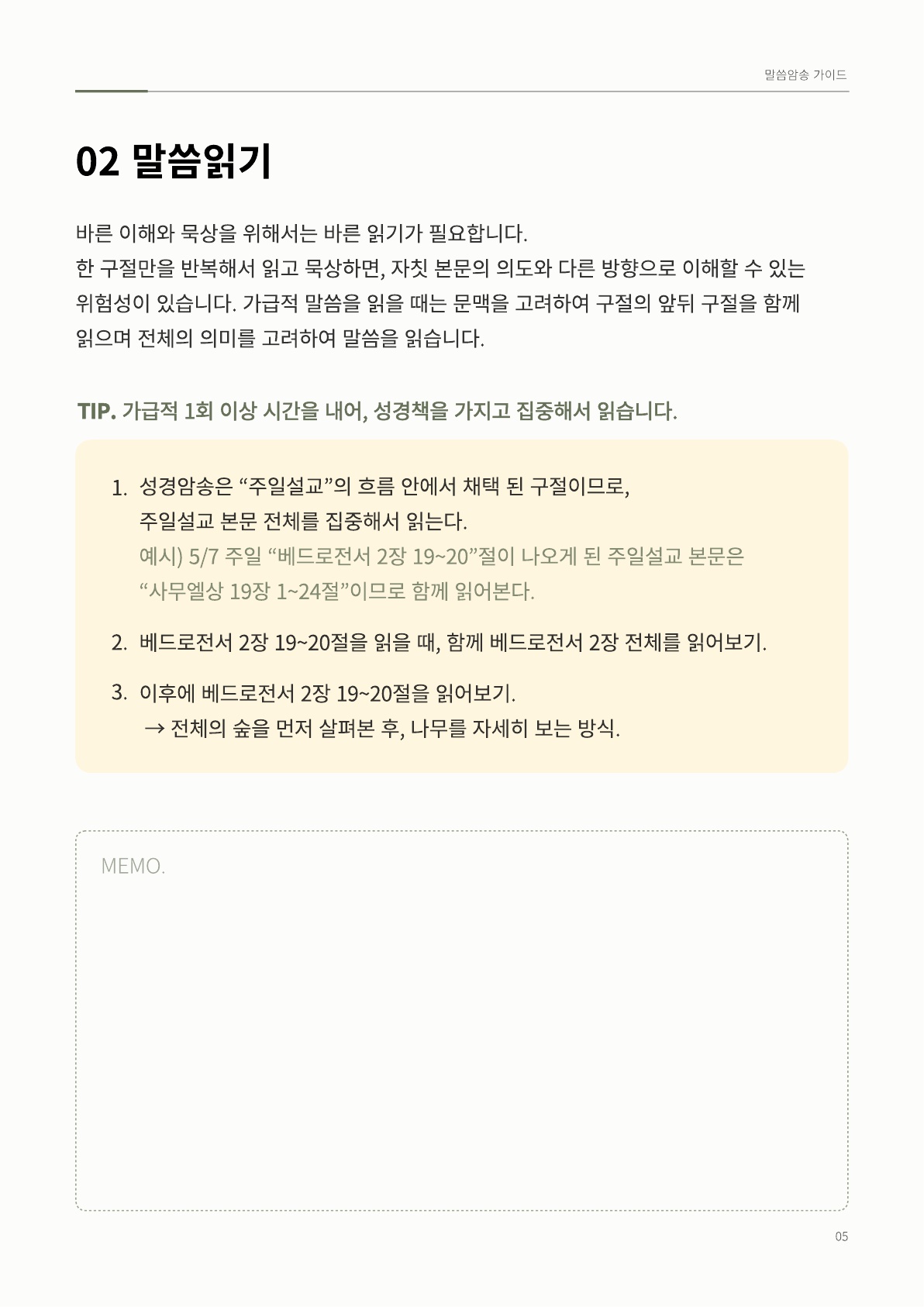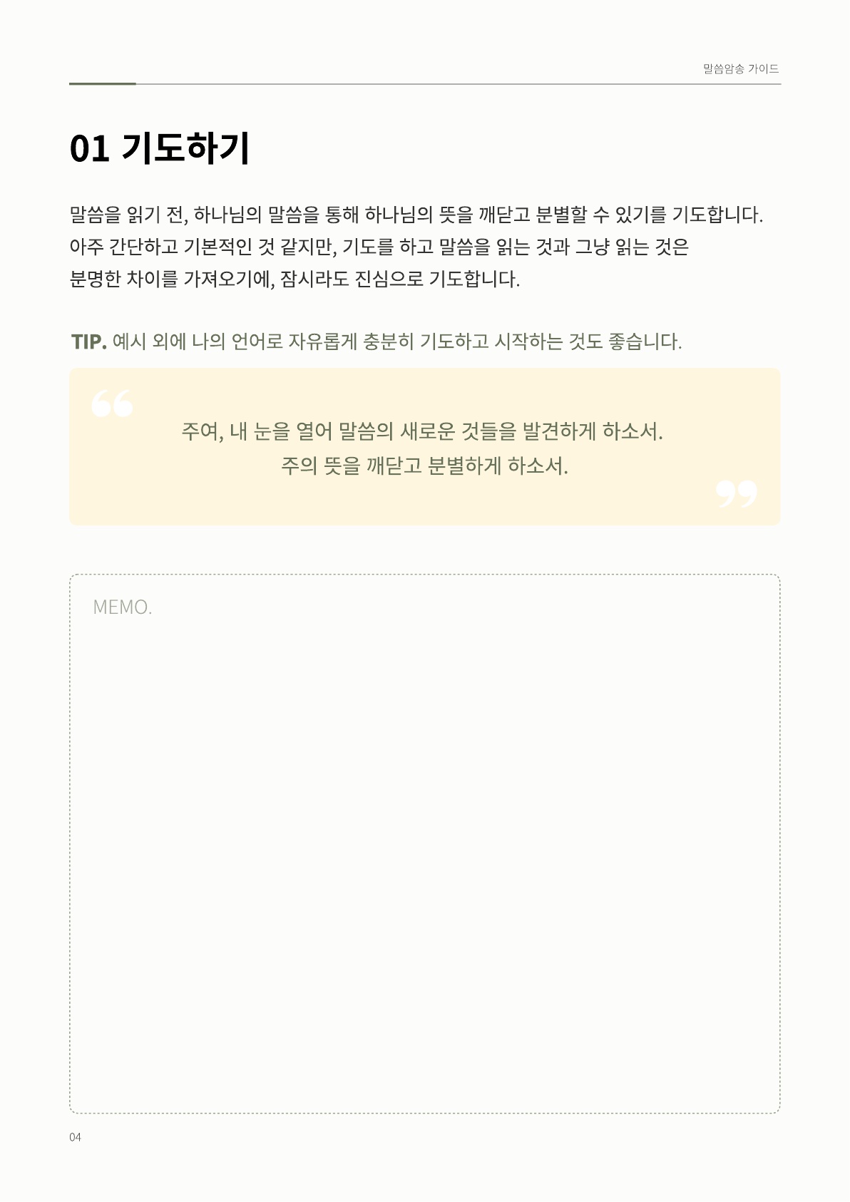 말씀 암송 가이드 ② 관리자 공지 0 61305 2024.12.07 05:45 말씀 암송 가이드 ② Author 1 1 Lv.77 관리자 최고관리자 367,730 (78.2%) 너희 안에 이 마음을 품으라 곧 그리스도 예수의 마음이니(빌립보서 2:5) Let this mind be in you, which was also in Christ Jesus(Philippians 2:5)