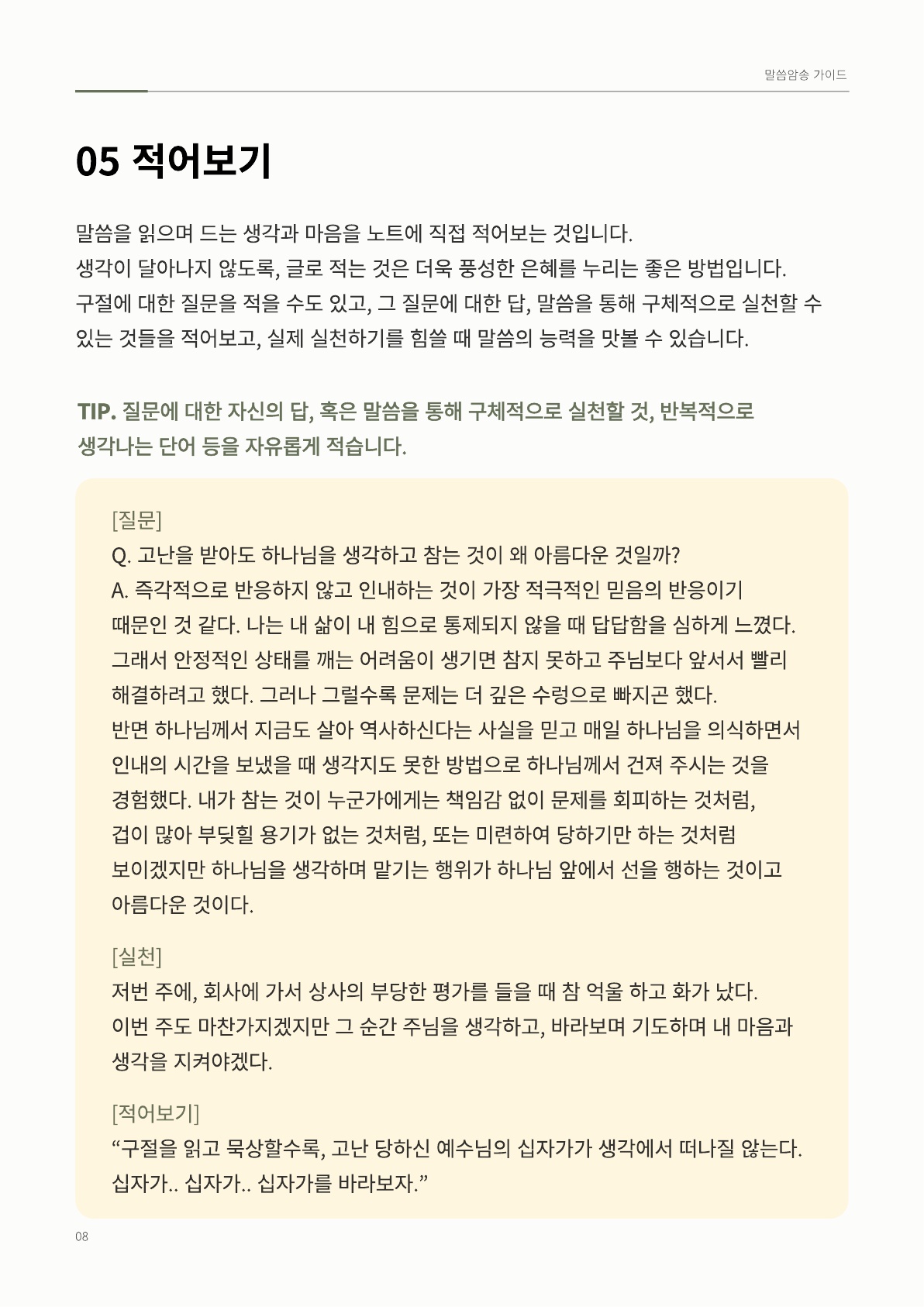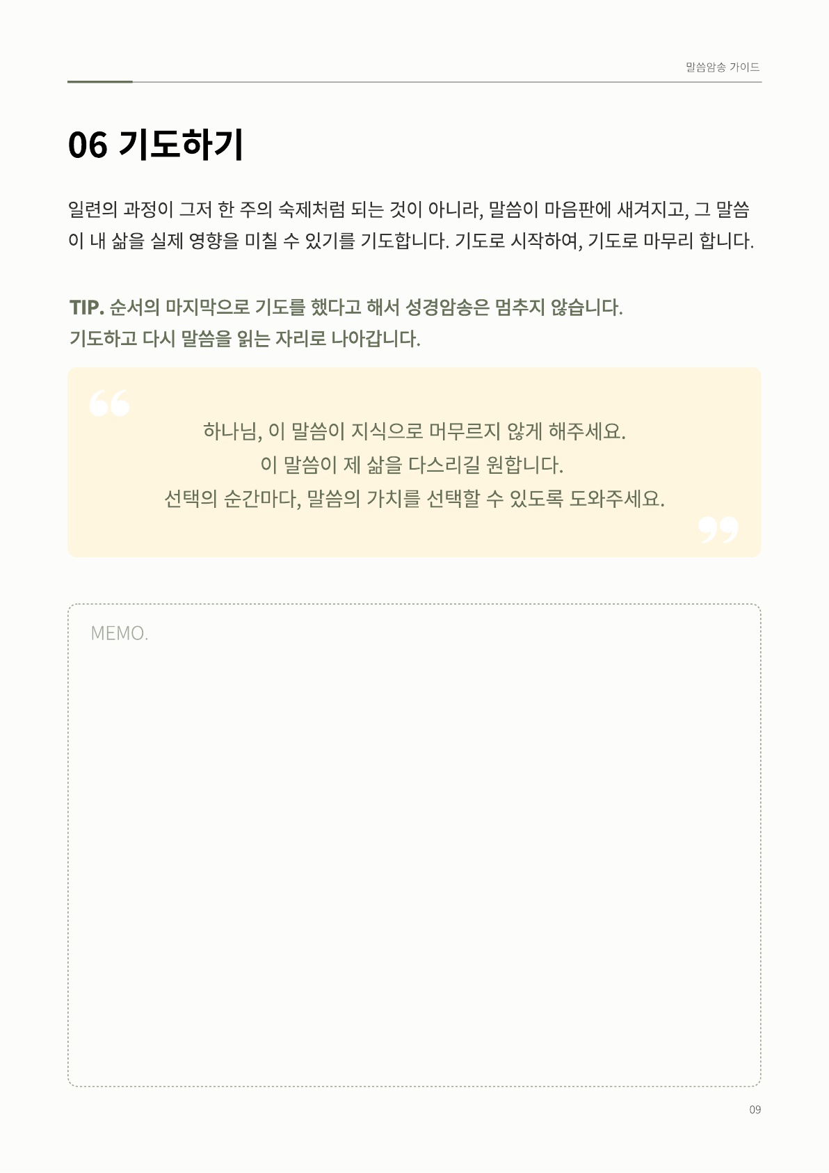 말씀 암송 가이드 ③ 관리자 공지 0 61222 2024.12.07 05:47 말씀 암송 가이드 ③ Author 1 1 Lv.77 관리자 최고관리자 367,730 (78.2%) 너희 안에 이 마음을 품으라 곧 그리스도 예수의 마음이니(빌립보서 2:5) Let this mind be in you, which was also in Christ Jesus(Philippians 2:5)