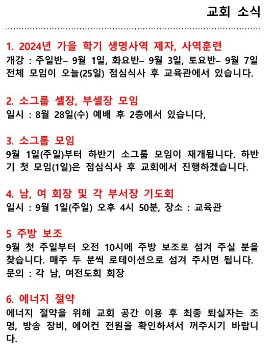 교회소식 (2024년 08월 25일 주일)
