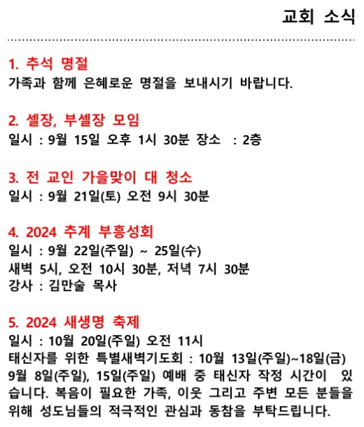 교회소식 (2024년 09월 15일 주일)