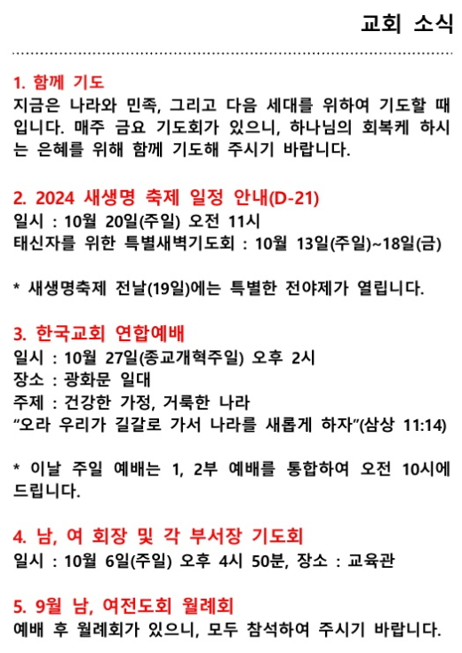 교회소식 (2024년 09월 29일 주일)