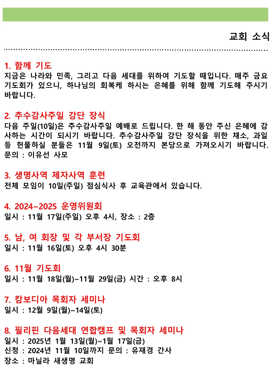 교회소식 (2024년 11월 03일 주일) 관리자 0 2860 2024.11.03 14:01 2024년 11월 03일 (주일) 교회소식입니다. Author 1 1 Lv.77 관리자 최고관리자 368,630 (88.7%) 너희 안에 이 마음을 품으라 곧 그리스도 예수의 마음이니(빌립보서 2:5) Let this mind be in you, which was also in Christ Jesus(Philippians 2:5)