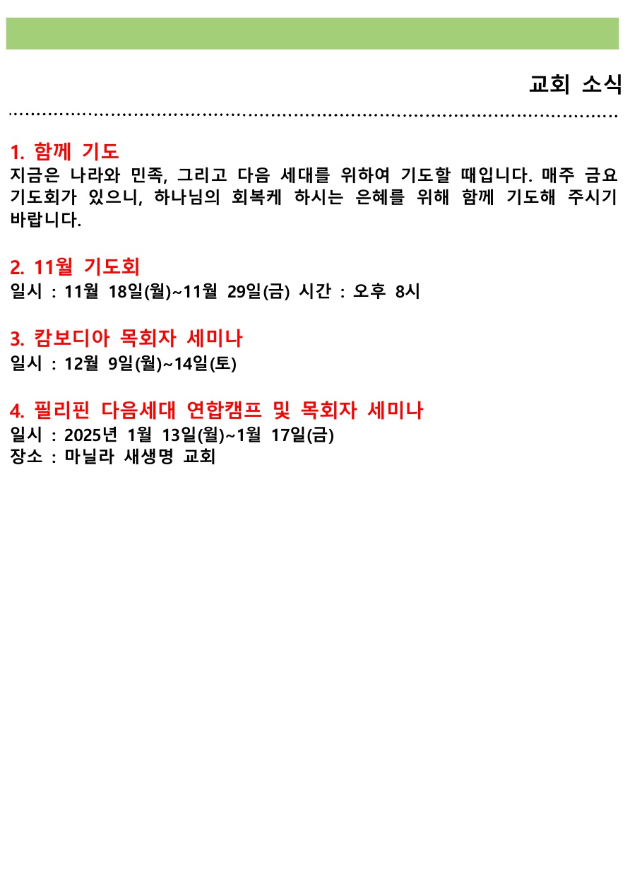 교회소식 (2024년 11월 24일 주일) 관리자 0 2612 2024.11.24 17:26 2024년 11월 24일 (주일) 교회소식입니다. Author 1 1 Lv.77 관리자 최고관리자 368,330 (85.2%) 너희 안에 이 마음을 품으라 곧 그리스도 예수의 마음이니(빌립보서 2:5) Let this mind be in you, which was also in Christ Jesus(Philippians 2:5)