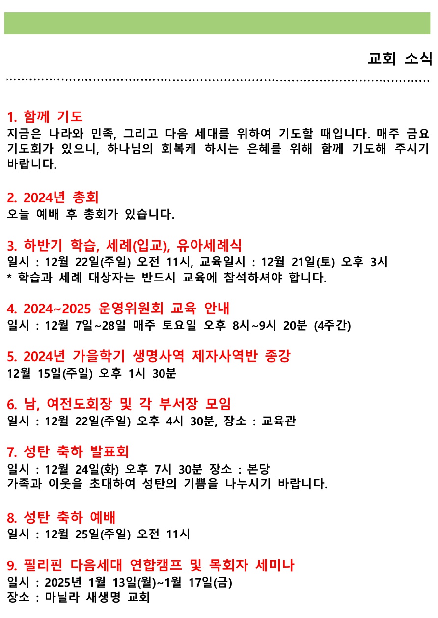 교회소식 (2024년 12월 15일 주일) 관리자 0 2413 2024.12.15 13:32 2024년 12월 15일 (주일) 교회소식입니다. Author 1 1 Lv.77 관리자 최고관리자 368,630 (88.7%) 너희 안에 이 마음을 품으라 곧 그리스도 예수의 마음이니(빌립보서 2:5) Let this mind be in you, which was also in Christ Jesus(Philippians 2:5)