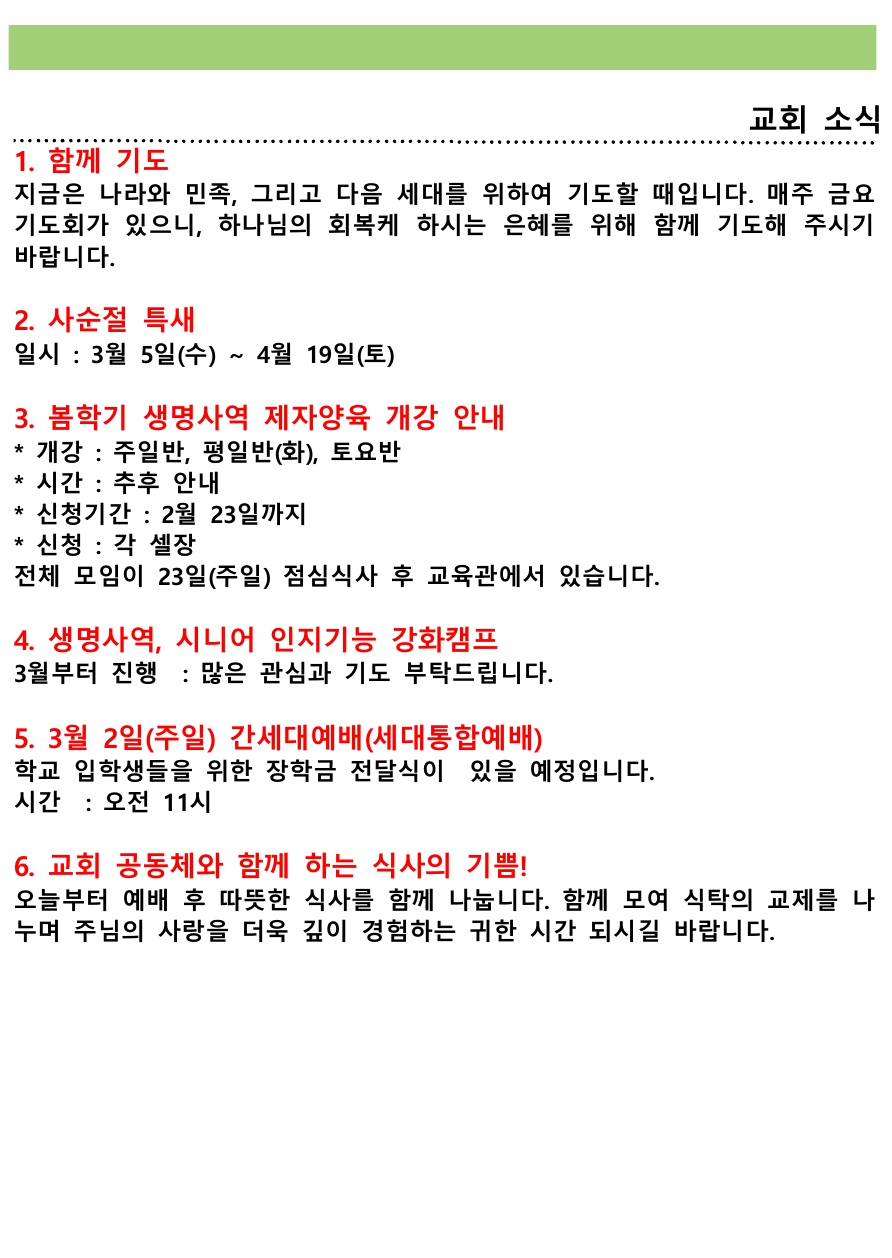 교회소식 (2025년 2월 23일 주일) 관리자 0 2366 2025.02.23 14:04 Author 1 1 Lv.77 관리자 최고관리자 368,380 (85.8%) 너희 안에 이 마음을 품으라 곧 그리스도 예수의 마음이니(빌립보서 2:5) Let this mind be in you, which was also in Christ Jesus(Philippians 2:5)