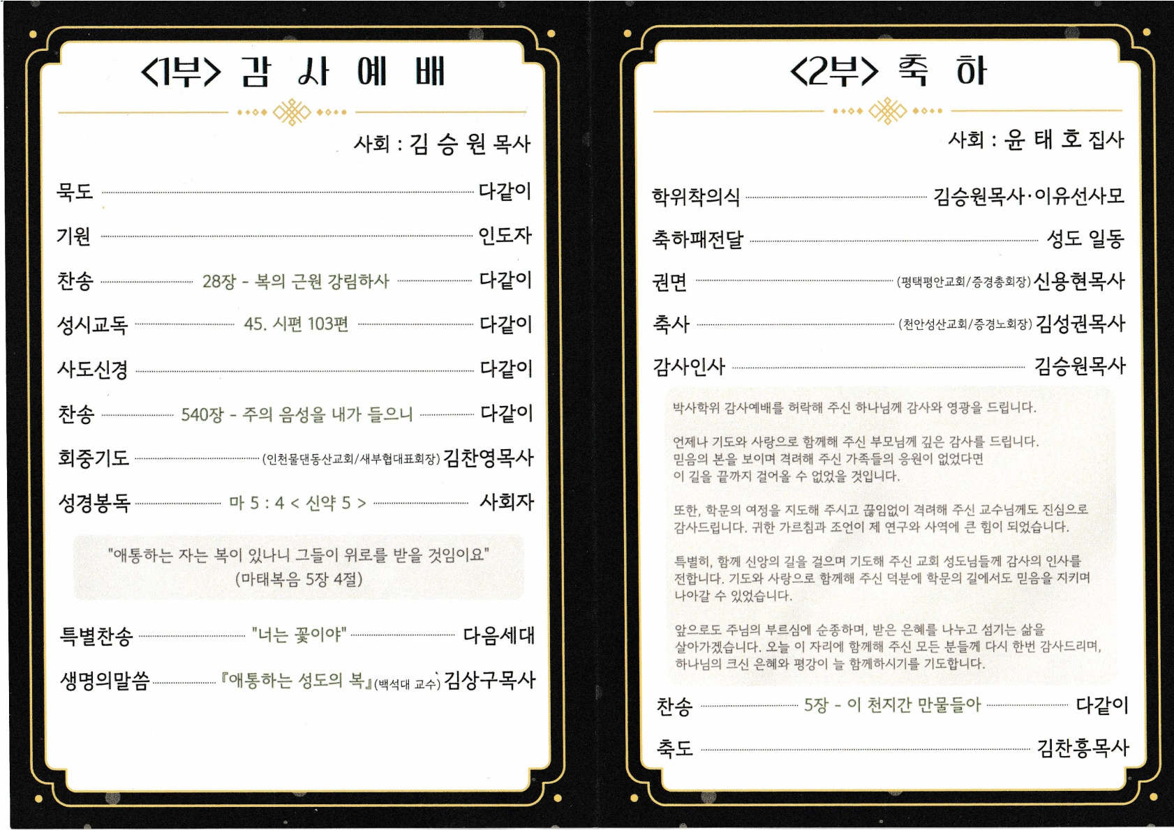2025년 3월 15일(토) 김승원 목사/이유선 사모 박사학위 취득 감사예배 순서 관리자 0 2311 2025.03.15 16:40 Author 1 1 Lv.77 관리자 최고관리자 368,330 (85.2%) 너희 안에 이 마음을 품으라 곧 그리스도 예수의 마음이니(빌립보서 2:5) Let this mind be in you, which was also in Christ Jesus(Philippians 2:5)