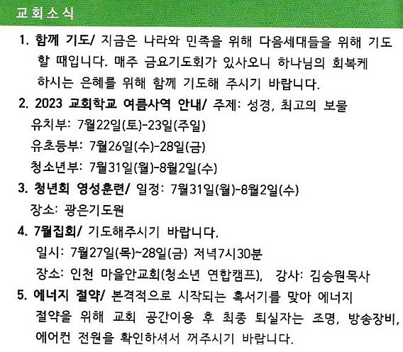 교회소식 (2023년 7월 23일 주일) 관리자 0 4004 2023.07.30 08:34 교회소식 (2023년 7월 23일 주일) Author 1 1 Lv.77 관리자 최고관리자 368,630 (88.7%) 너희 안에 이 마음을 품으라 곧 그리스도 예수의 마음이니(빌립보서 2:5) Let this mind be in you, which was also in Christ Jesus(Philippians 2:5)