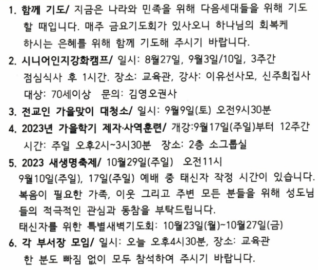 교회소식 (2023년 09월 03일 주일) 관리자 0 3990 2023.09.27 05:53 교회소식 (2023년 09월 03일 주일) Author 1 1 Lv.77 관리자 최고관리자 368,430 (86.3%) 너희 안에 이 마음을 품으라 곧 그리스도 예수의 마음이니(빌립보서 2:5) Let this mind be in you, which was also in Christ Jesus(Philippians 2:5)