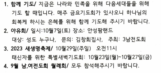 교회소식 (2023년 09월 24일 주일) 관리자 0 4162 2023.09.27 06:57 교회소식 (2023년 09월 24일 주일) Author 1 1 Lv.77 관리자 최고관리자 368,380 (85.8%) 너희 안에 이 마음을 품으라 곧 그리스도 예수의 마음이니(빌립보서 2:5) Let this mind be in you, which was also in Christ Jesus(Philippians 2:5)