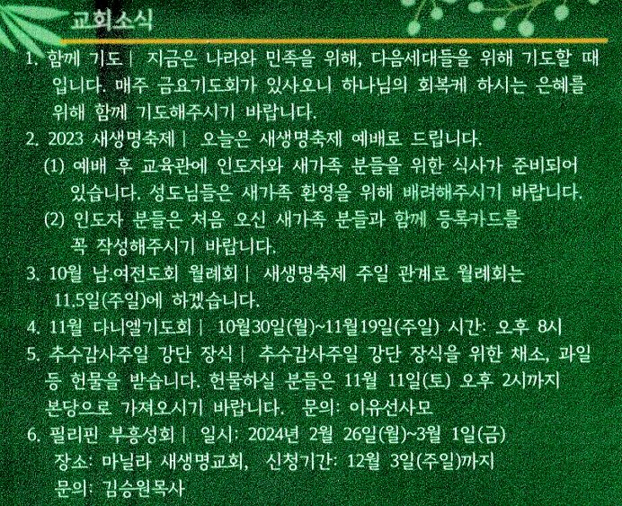 교회소식 (2023년 10월 29일 주일) 병천교회 0 4165 2023.10.29 13:13 2023년 10월 29일 (주일) 교회소식입니다. Author 1 0 Lv.1 병천교회 최고관리자 0 (0%) 너희도 그들 중에서 예수 그리스도의 것으로 부르심을 받은 자니라. And you also are among those who are called to belong to Jesus Christ. (롬 1:6 - Rm 1:6)