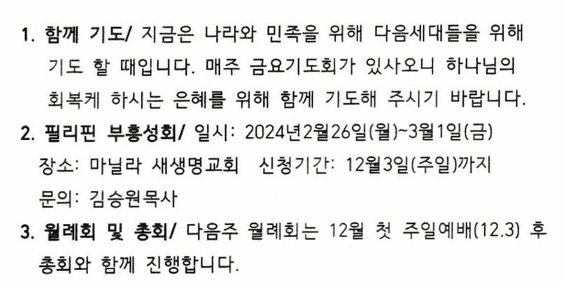 교회소식 (2023년 11월 19일 주일) 관리자 0 3742 2023.12.03 09:17 2023년 11월 12일 (주일) 교회소식입니다. Author 1 1 Lv.77 관리자 최고관리자 368,380 (85.8%) 너희 안에 이 마음을 품으라 곧 그리스도 예수의 마음이니(빌립보서 2:5) Let this mind be in you, which was also in Christ Jesus(Philippians 2:5)