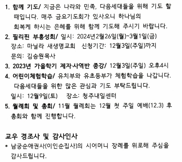 교회소식 (2023년 11월 26일 주일) 관리자 0 4032 2023.12.03 09:18 2023년 11월 26일 (주일) 교회소식입니다. Author 1 1 Lv.77 관리자 최고관리자 368,380 (85.8%) 너희 안에 이 마음을 품으라 곧 그리스도 예수의 마음이니(빌립보서 2:5) Let this mind be in you, which was also in Christ Jesus(Philippians 2:5)