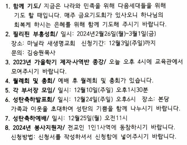 교회소식 (2023년 12월 03일 주일) 관리자 0 3756 2023.12.03 13:06 2023년 12월 03일 (주일) 교회소식입니다. Author 1 1 Lv.77 관리자 최고관리자 368,630 (88.7%) 너희 안에 이 마음을 품으라 곧 그리스도 예수의 마음이니(빌립보서 2:5) Let this mind be in you, which was also in Christ Jesus(Philippians 2:5)