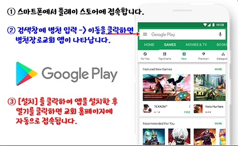 저희 병천교회 홈페이지 앱이 플레이 스토어 (구글 플레이)에 정식 절차를 밟아서 2022년 6월 24일 등록이 되었습니다.