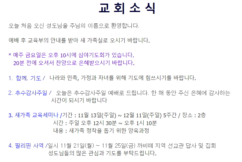 교회소식 (2022년 11월 13일 주일) 관리자 0 4890 2022.11.13 12:47 Author 1 1 Lv.77 관리자 최고관리자 368,380 (85.8%) 너희 안에 이 마음을 품으라 곧 그리스도 예수의 마음이니(빌립보서 2:5) Let this mind be in you, which was also in Christ Jesus(Philippians 2:5)