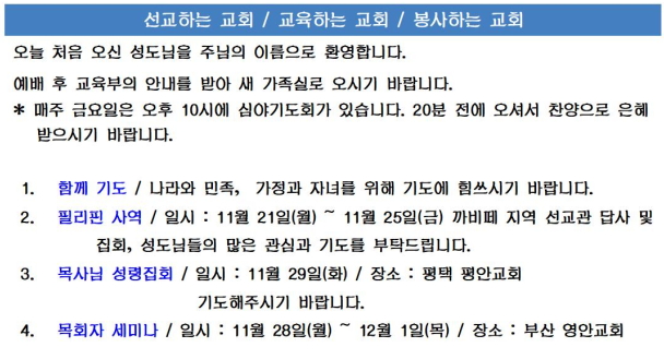 교회소식 (2022년 11월 20일 주일) 관리자 0 4813 2022.11.20 13:41 Author 1 1 Lv.77 관리자 최고관리자 368,630 (88.7%) 너희 안에 이 마음을 품으라 곧 그리스도 예수의 마음이니(빌립보서 2:5) Let this mind be in you, which was also in Christ Jesus(Philippians 2:5)